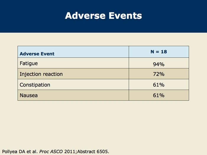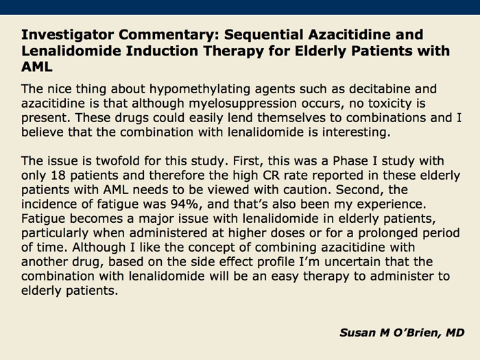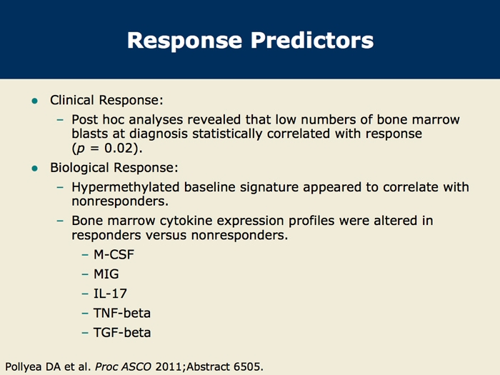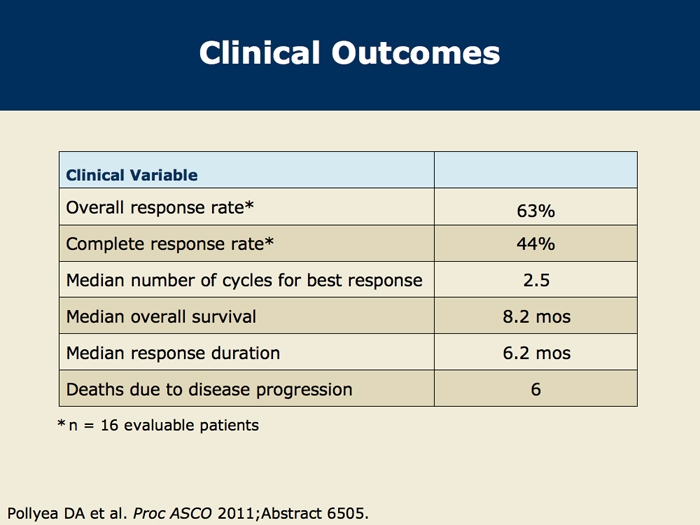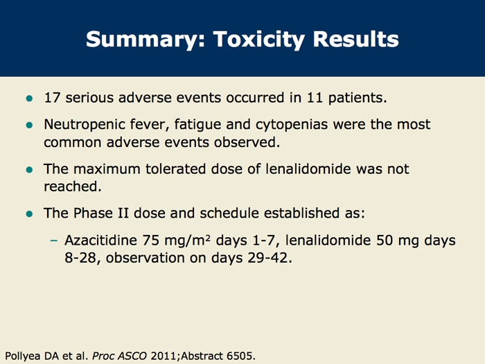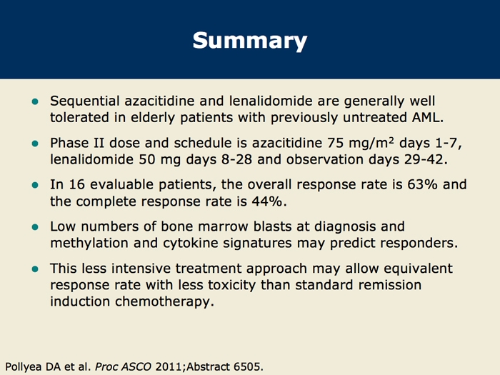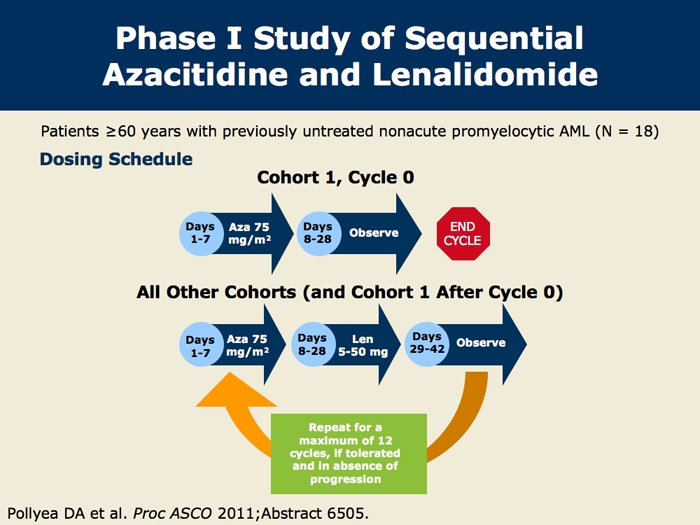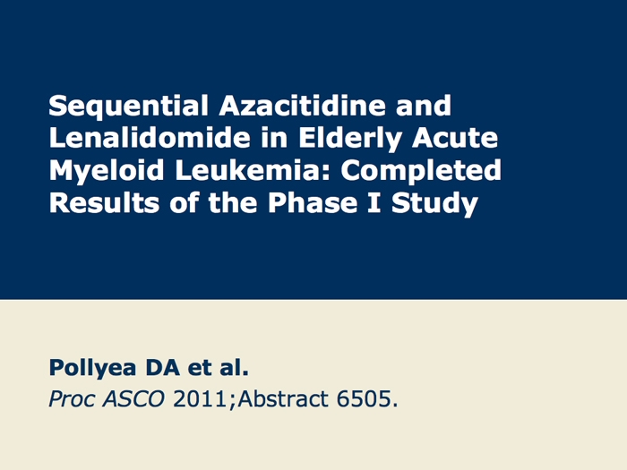 Pollyea DA et al. Sequential azacitidine and lenalidomide in elderly acute myeloid leukemia: Completed results of the phase I study. Proc ASCO 2011;Abstract 6505.