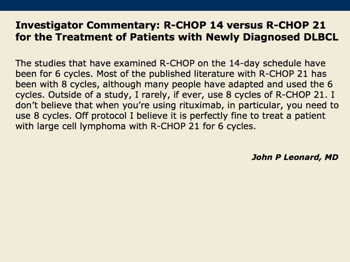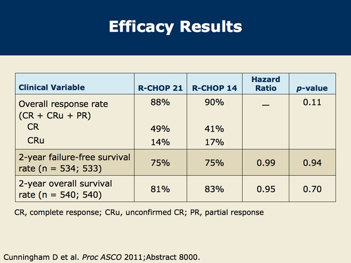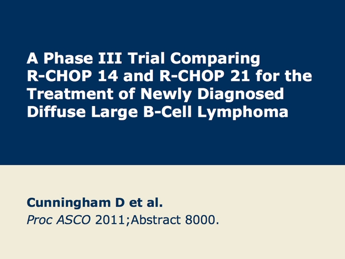 Cunningham D et al. R-CHOP14 versus R-CHOP21: Result of a randomized Phase III trial for the treatment of patients with newly diagnosed diffuse large B-cell lymphoma. Proc ASCO 2011;Abstract 8000.
