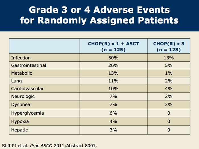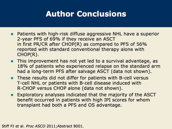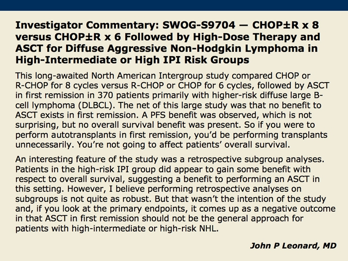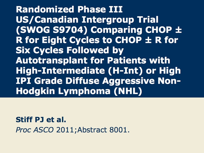 Stiff PJ et al. Randomized Phase III US/Canadian Intergroup trial (SWOG S9704) comparing CHOP±R x 8 vs CHOP±R x 6 followed by high dose therapy and auto transplant for patients with diffuse aggressive non-Hodgkin's lymphoma (NHL) in high-intermediate (H-Int) or high IPI risk groups. Proc ASCO 2011;Abstract 8001.