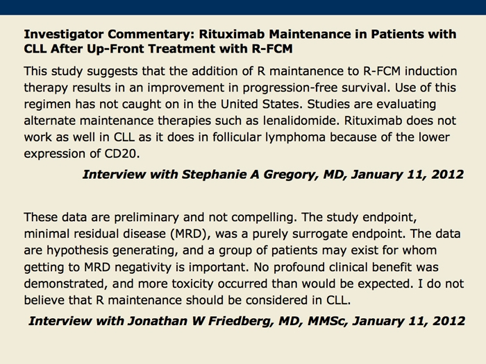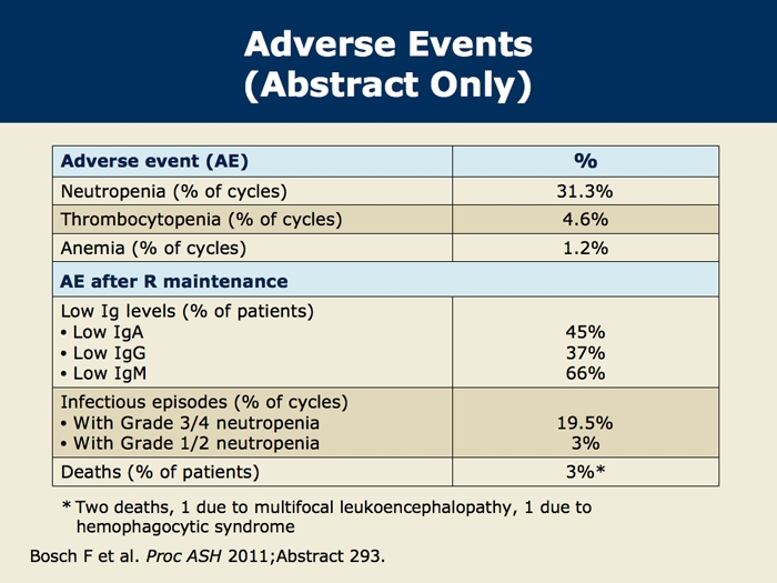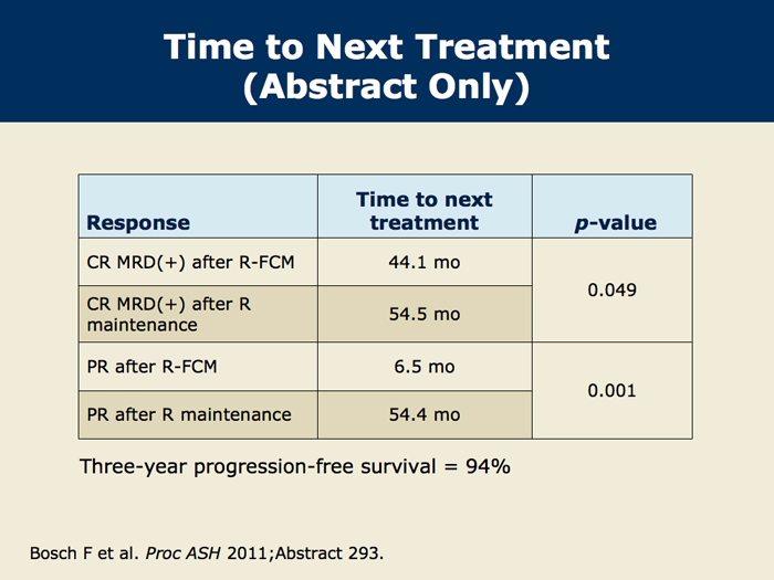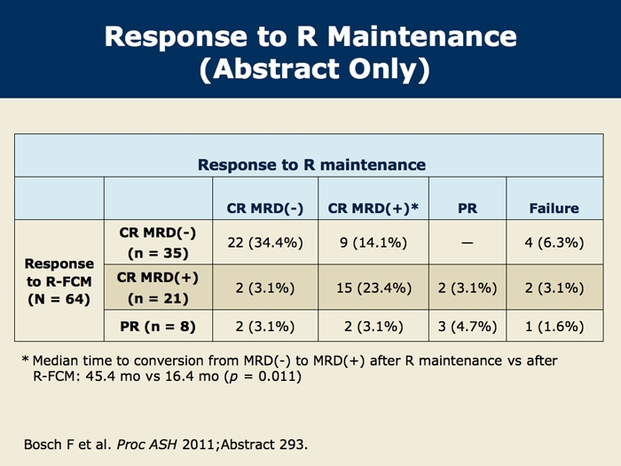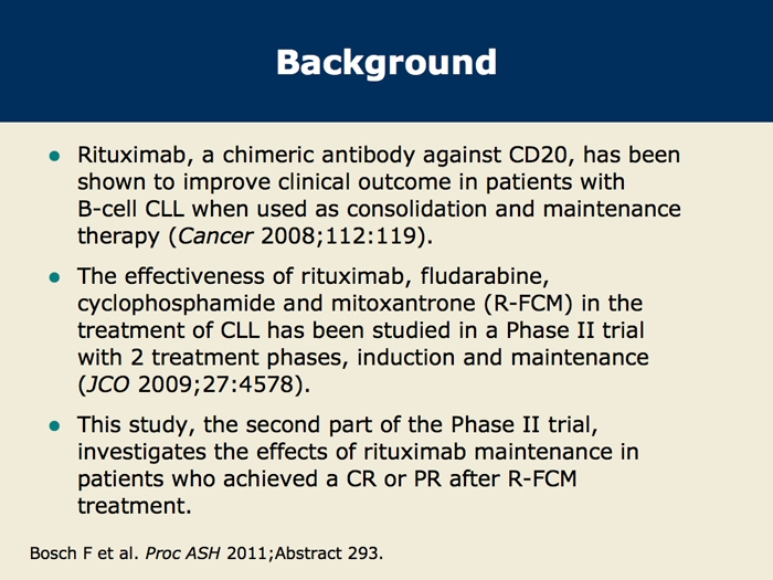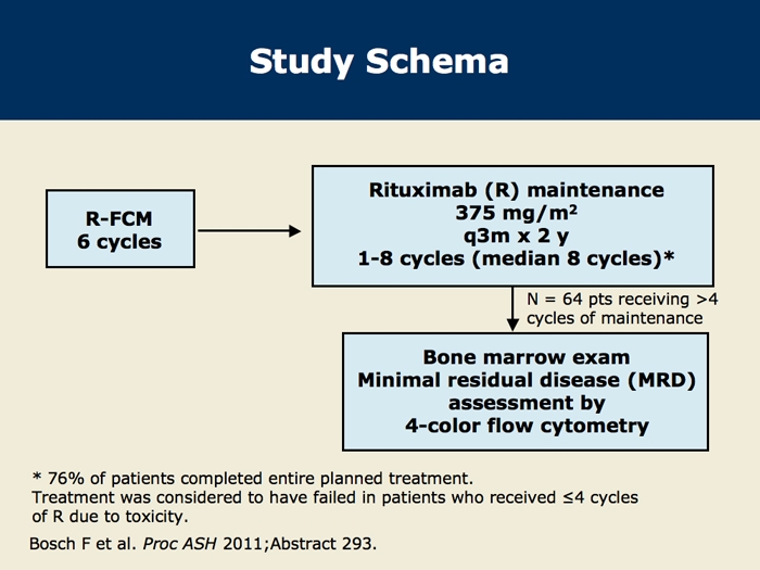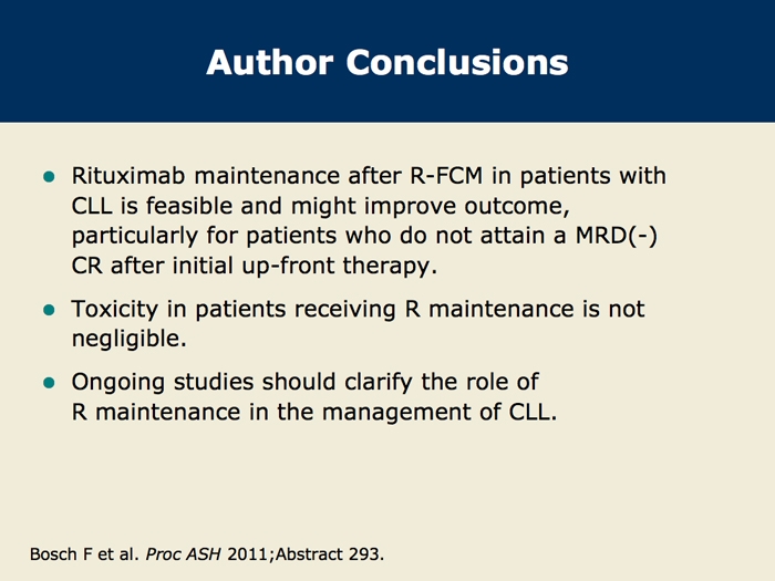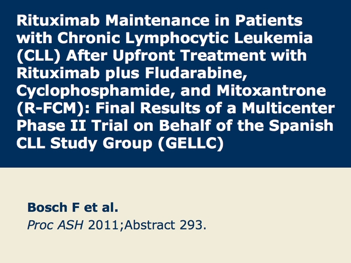 Bosch F et al. Rituximab maintenance in patients with chronic lymphocytic leukemia (CLL) after upfront treatment with rituximab plus fludarabine, cyclophosphamide, and mitoxantrone (R-FCM): Final results of a multicenter Phase II trial on behalf of the Spanish CLL Study Group (GELLC). Proc ASH 2011;Abstract 293.
