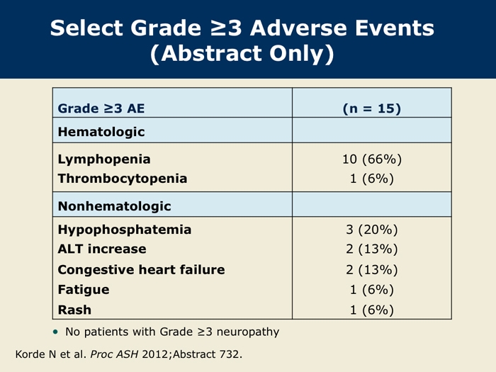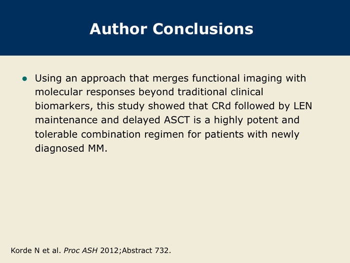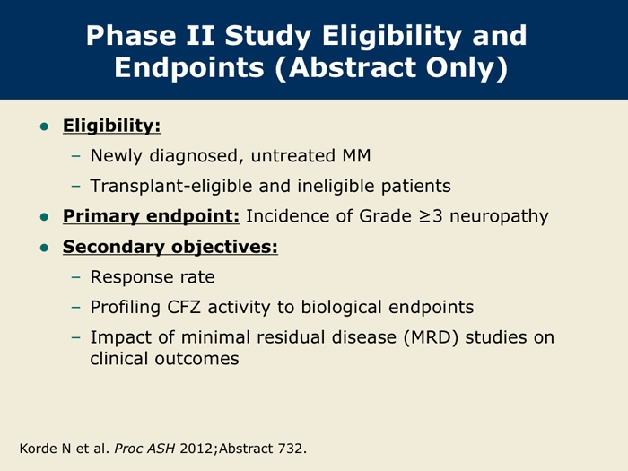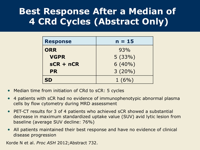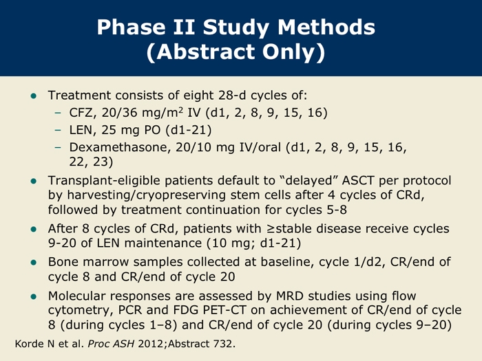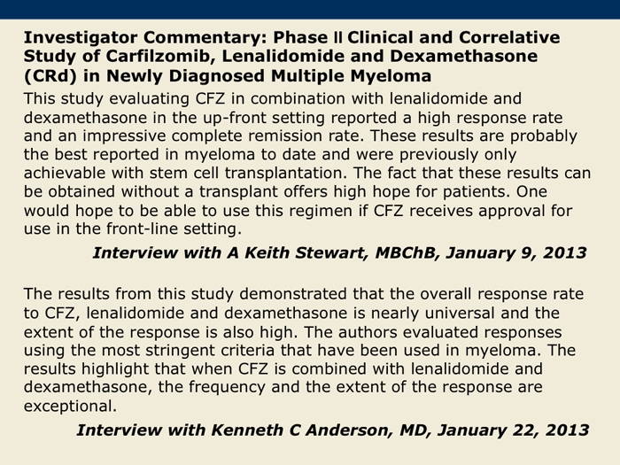 Korde N et al. Phase II clinical and correlative study of carfilzomib, lenalidomide, and dexamethasone (CRd) in newly diagnosed multiple myeloma (MM) patients. Proc ASH 2012;Abstract 732.