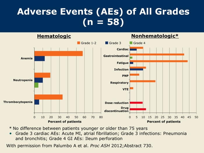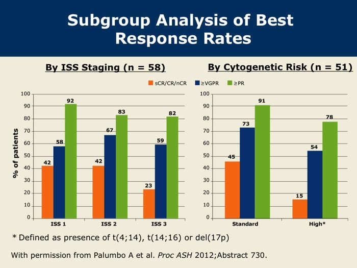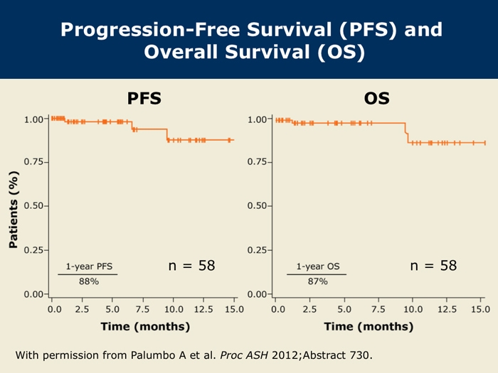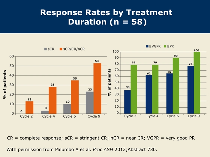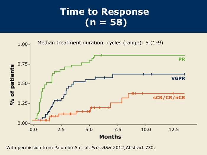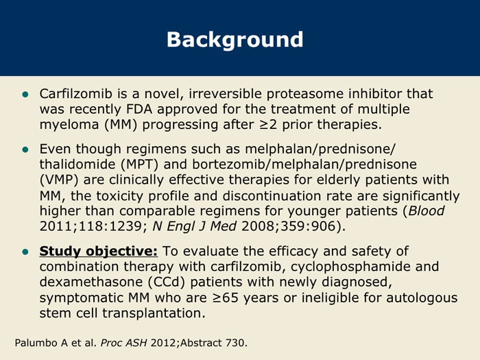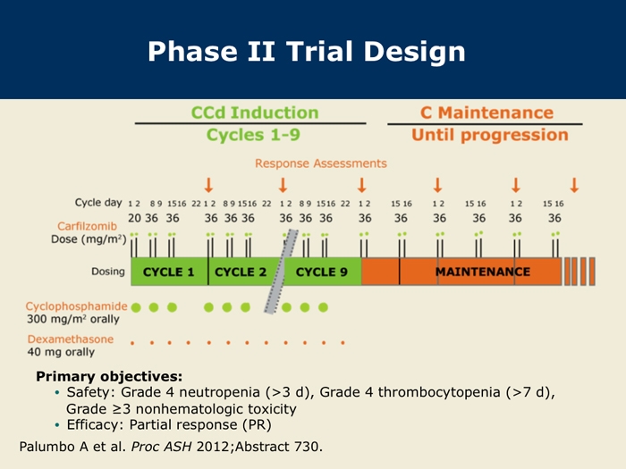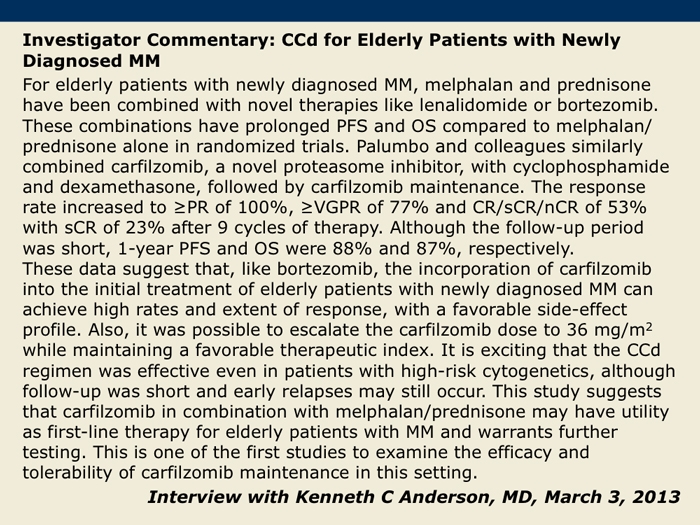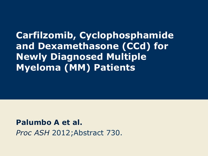 Palumbo A et al. Carfilzomib, cyclophosphamide and dexamethasone (CCd) for newly diagnosed multiple myeloma (MM) patients. Proc ASH 2012;Abstract 730.