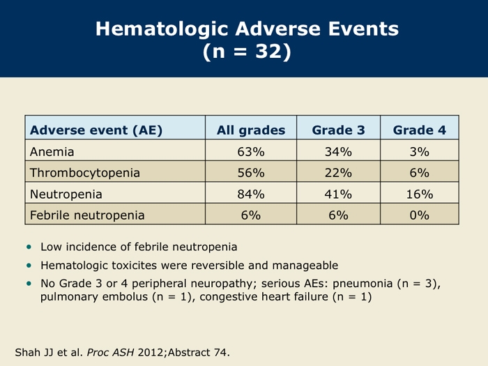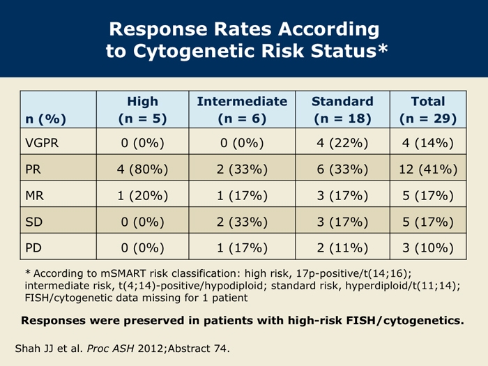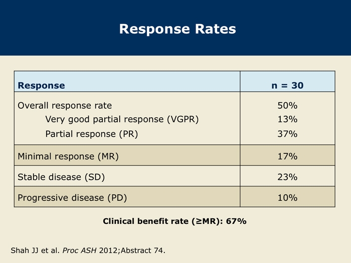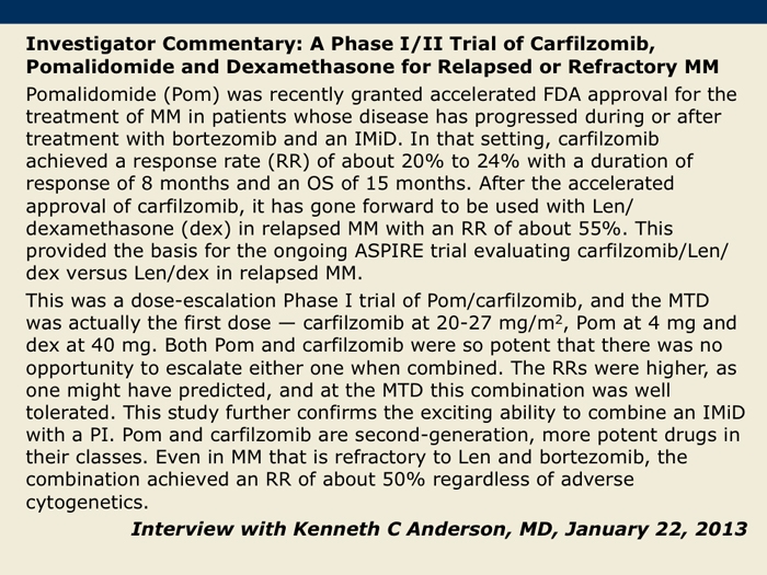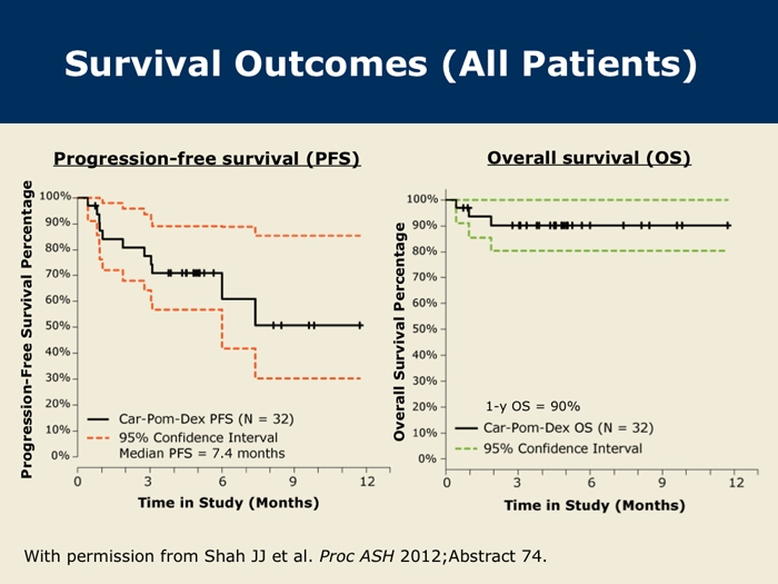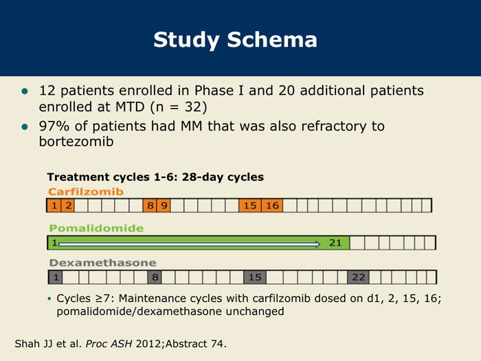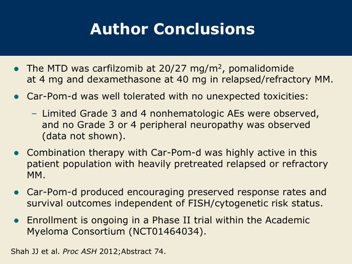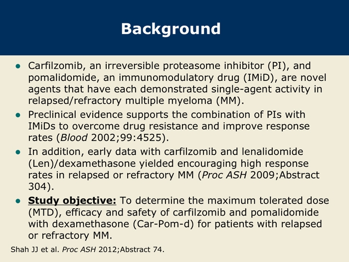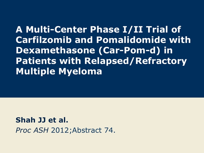 Shah J et al. A multi-center Phase I/II trial of carfilzomib and pomalidomide with dexamethasone (Car-Pom-d) in patients with relapsed/refractory multiple myeloma. Proc ASH 2012;Abstract 74.