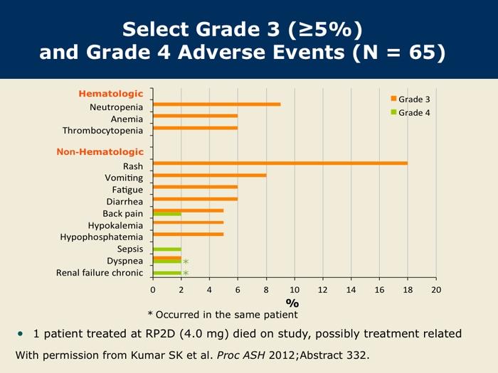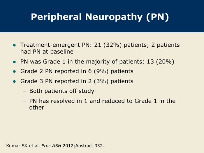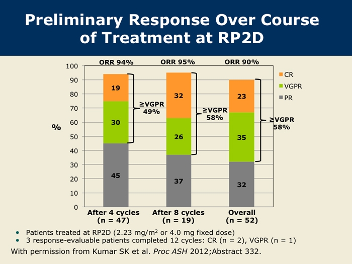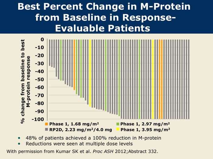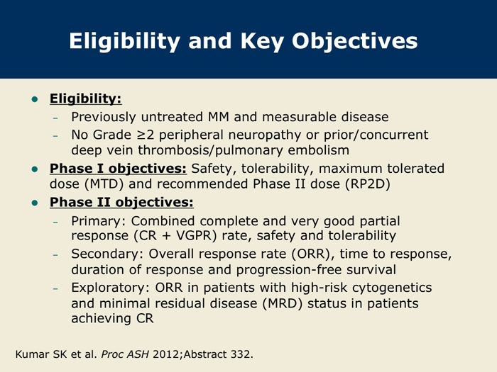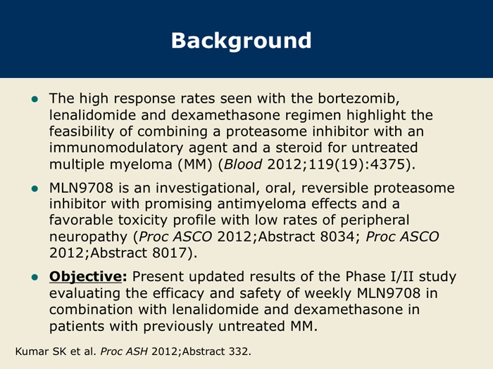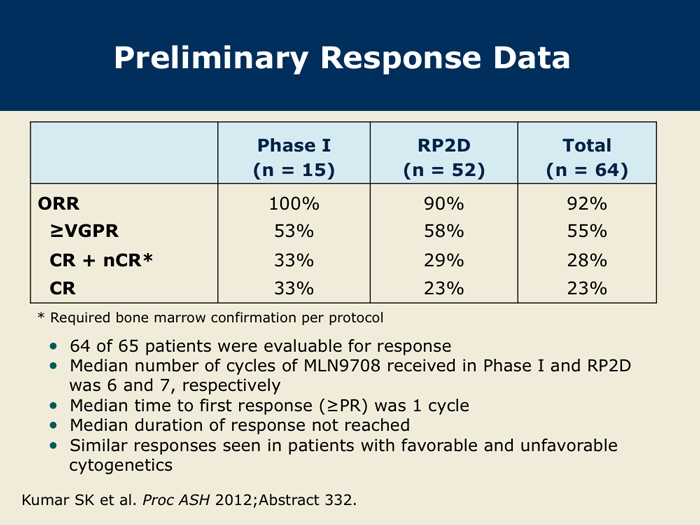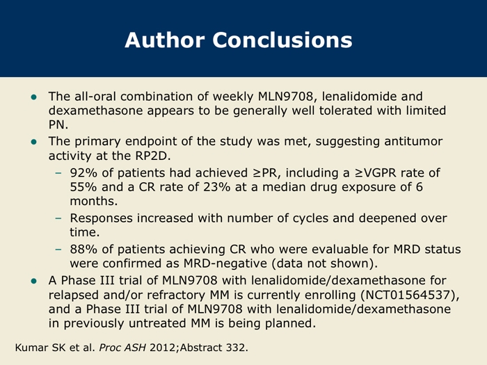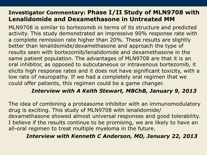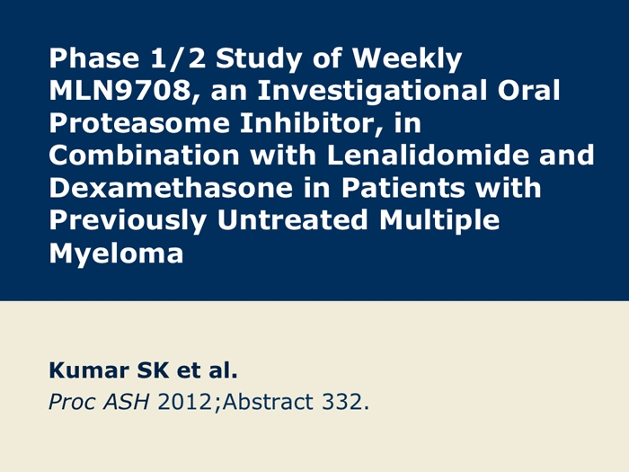 Kumar S et al. A Phase 1/2 study of weekly MLN9708, an investigational oral proteasome inhibitor, in combination with lenalidomide and dexamethasone in patients with previously untreated multiple myeloma (MM). Proc ASH 2012;Abstract 332.