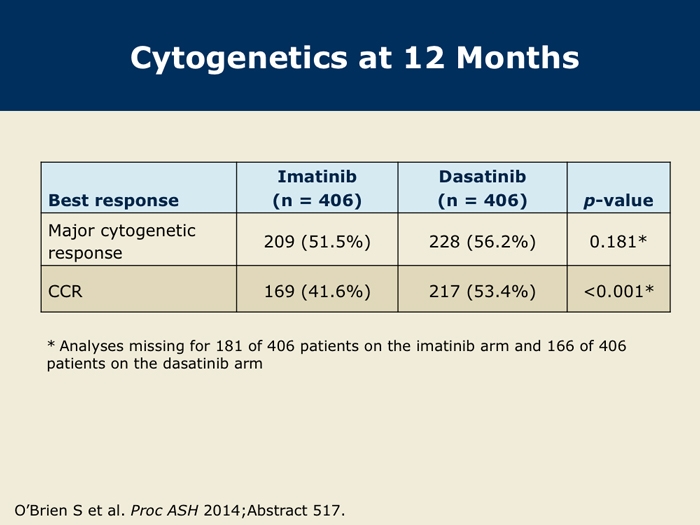 Cortes J et al. Final study results of the phase 3 dasatinib versus imatinib in newly diagnosed chronic myeloid leukemia in chronic phase (CML-CP) trial (DASISION, CA180-056). Proc ASH 2014; Abstract 152.