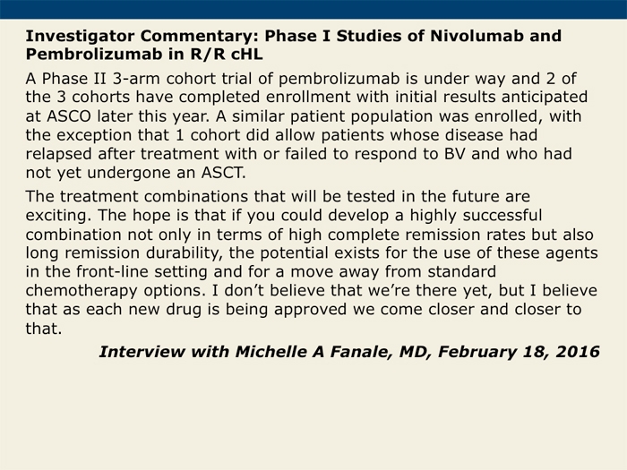 Armand P et al. PD-1 blockade with pembrolizumab in patients with classical Hodgkin lymphoma after brentuximab vedotin failure: Safety, efficacy, and biomarker assessment. Proc ASH 2015; Abstract 584.