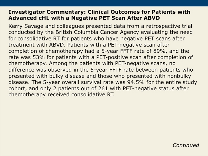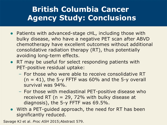 Savage KJ et al. Advanced stage classical Hodgkin lymphoma patients with a negative PET-scan following treatment with ABVD have excellent outcomes without the need for consolidative radiotherapy regardless of disease bulk at presentation. Proc ASH 2015; Abstract 579.