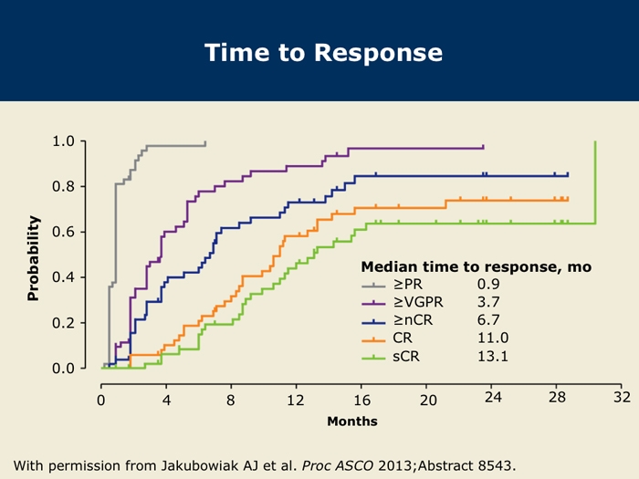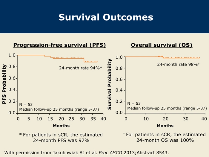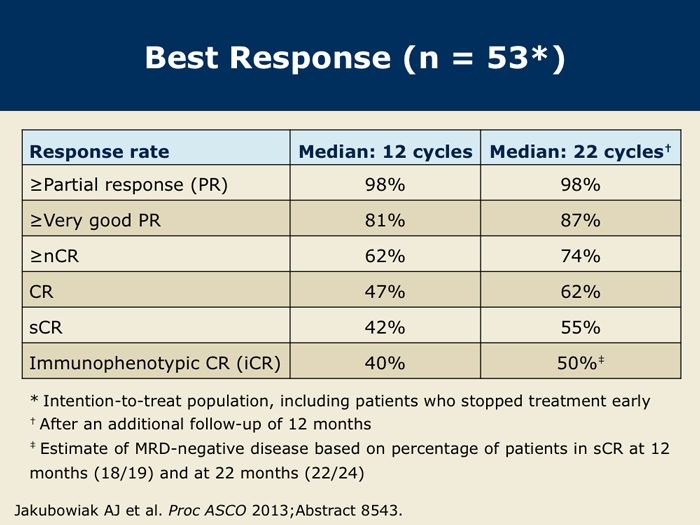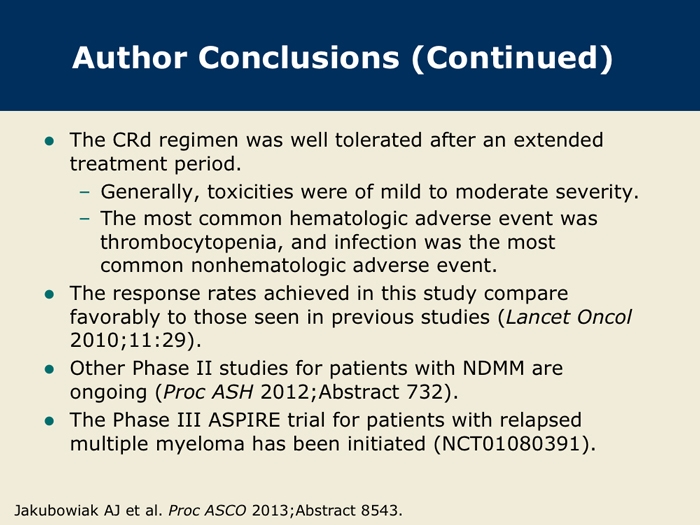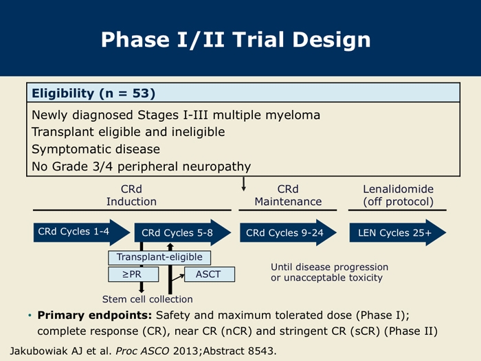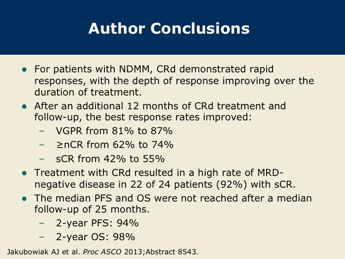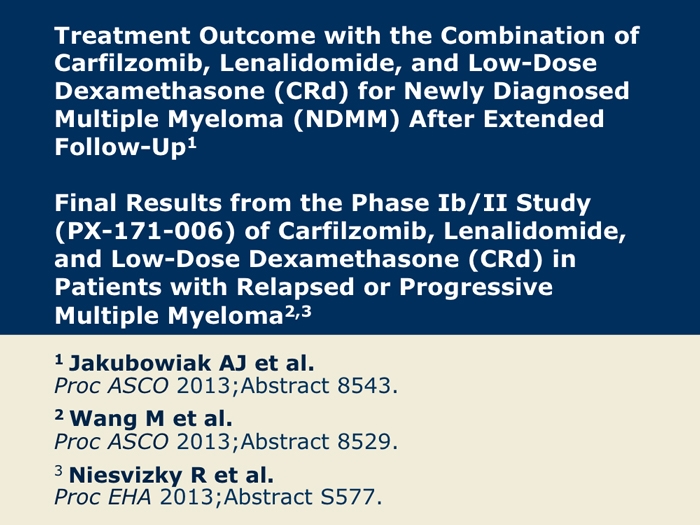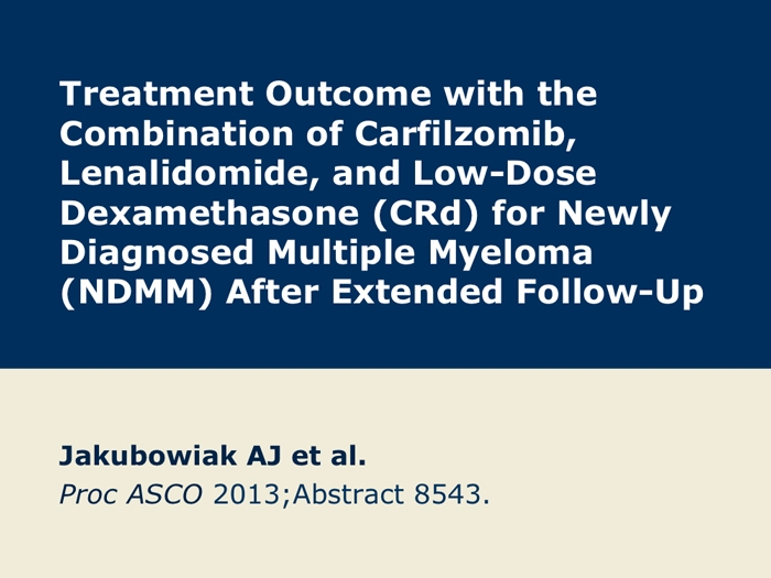 Jakubowiak AJ et al. Treatment outcome with the combination of carfilzomib, lenalidomide, and low-dose dexamethasone (CRd) for newly diagnosed multiple myeloma (NDMM) after extended follow-up. Proc ASCO 2013; Abstract 8543.