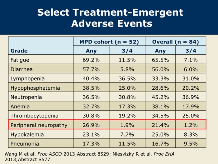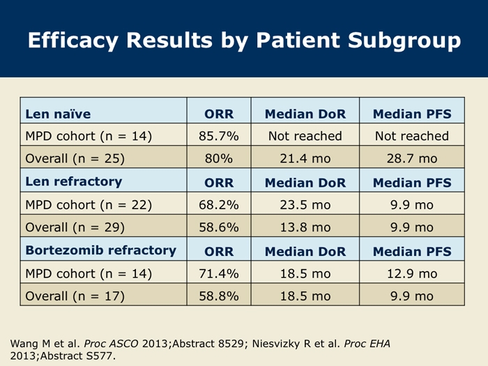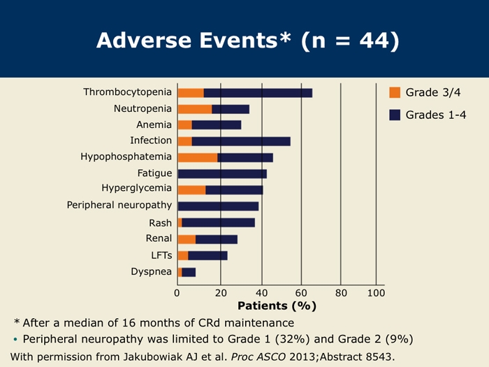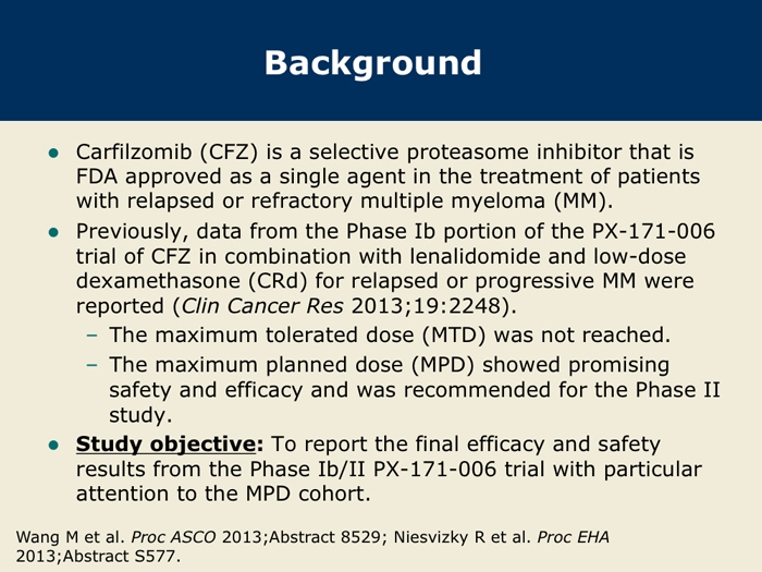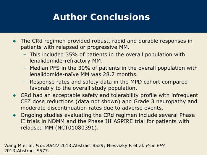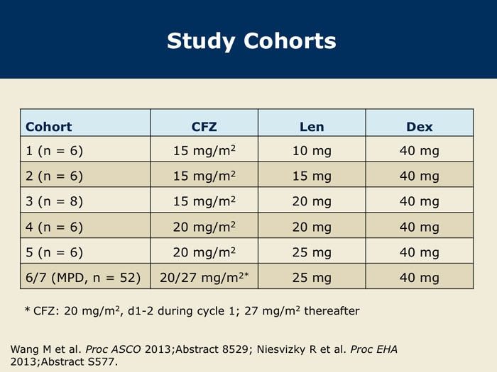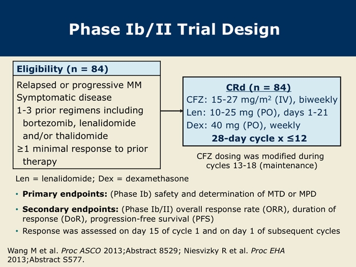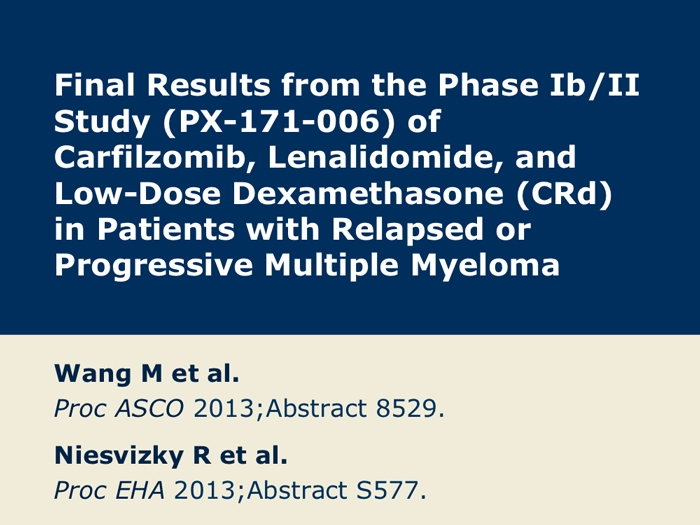 Wang M et al. Final results from the Phase Ib/II study (PX-171-006) of carfilzomib, lenalidomide, and low-dose dexamethasone (CRd) in patients with relapsed or progressive multiple myeloma. Proc ASCO 2013; Abstract 8529.