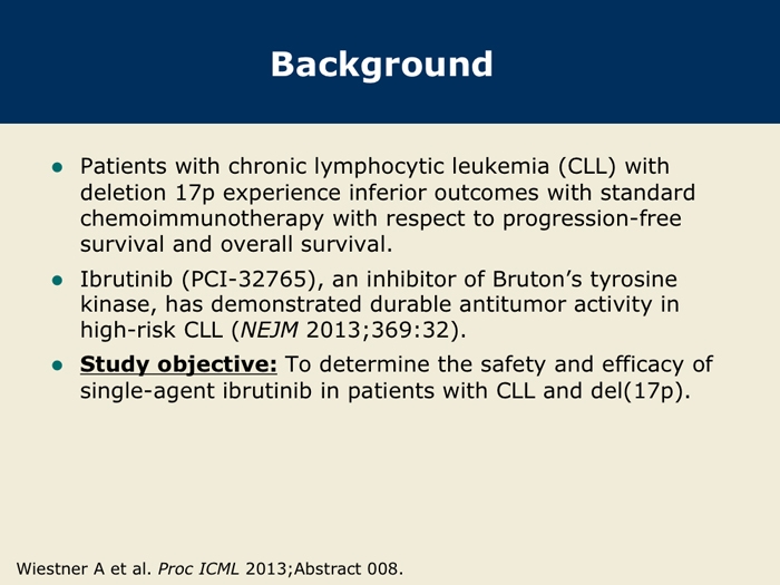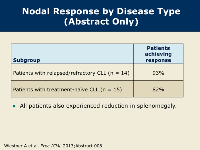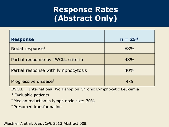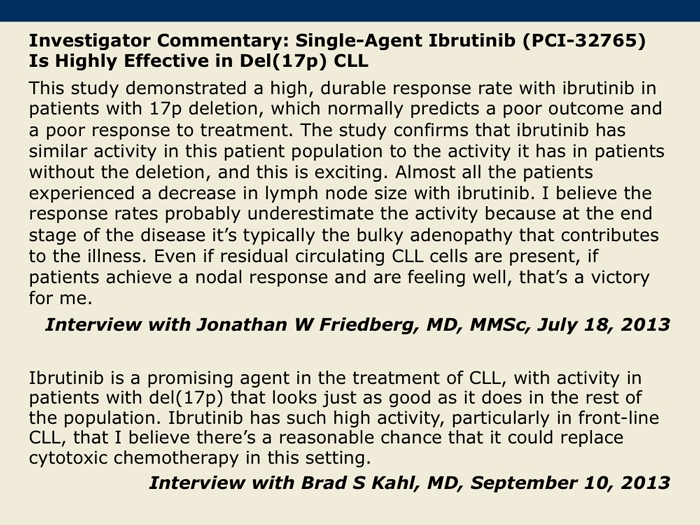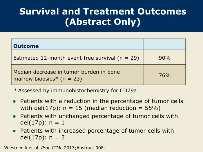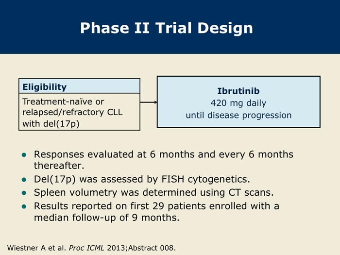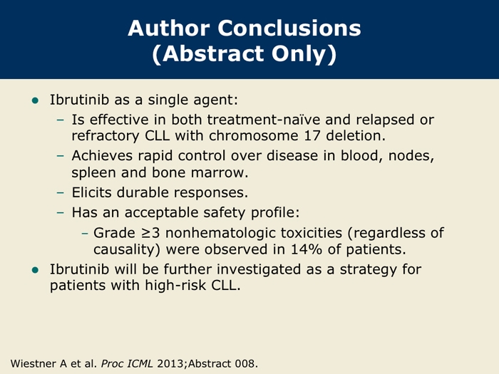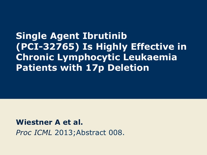Wiestner A et al. Single agent ibrutinib (PCI-32765) is highly effective in chronic lymphocytic leukaemia patients with 17P deletion. Proc ICML 2013;Abstract 008.