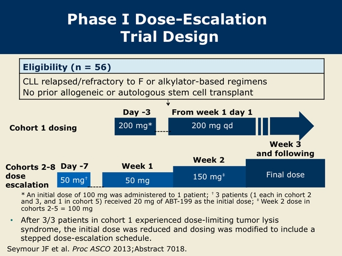 Seymour JF et al. Updated results of a Phase I first-in-human study of the Bcl-2 inhibitor ABT-199 (GDC-0199) in patients with relapsed/refractory (R/R) chronic lymphocytic leukemia (CLL). Proc ASCO 2013;Abstract 7018.