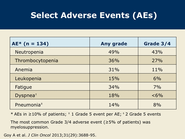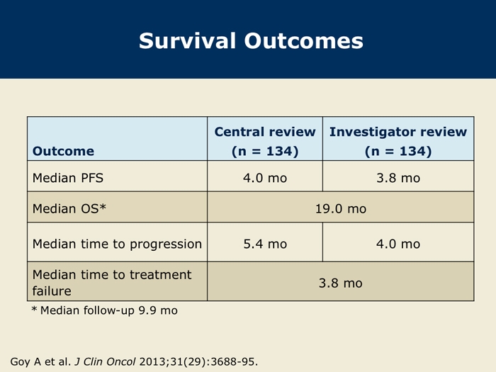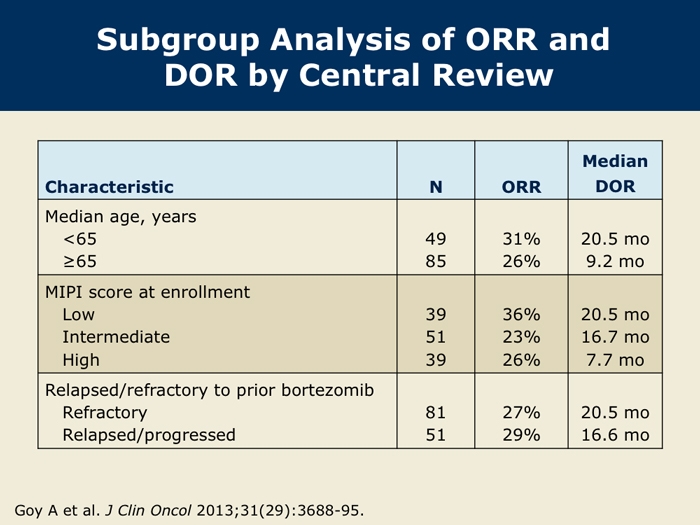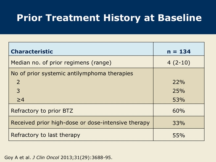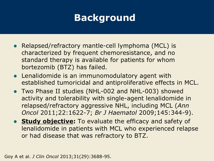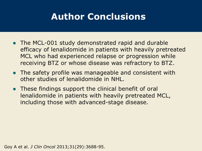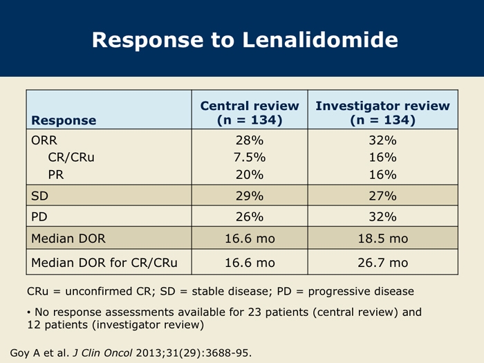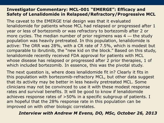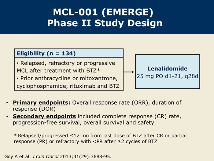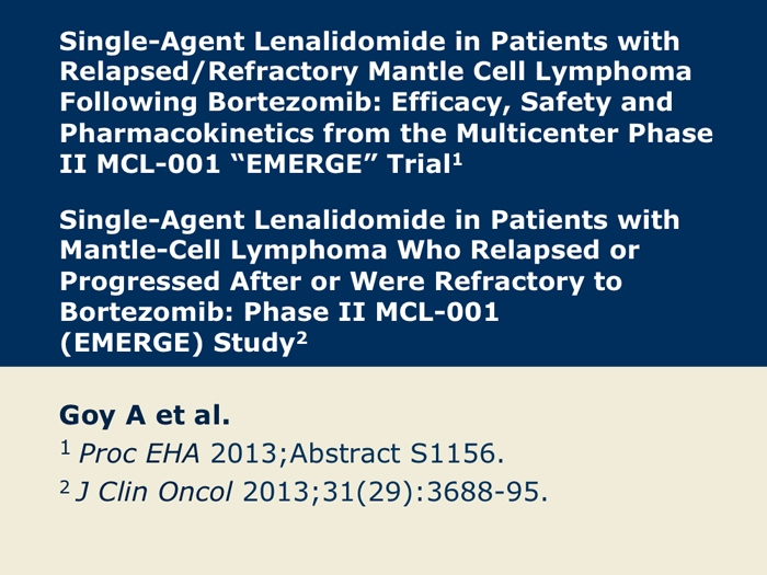 Goy A et al. Single-agent lenalidomide in patients with relapsed/refractory mantle cell lymphoma following bortezomib: Efficacy, safety and pharmacokinetics from the multicenter Phase II MCL-001 “EMERGE” trial. Proc EHA 2013; Abstract S1156.