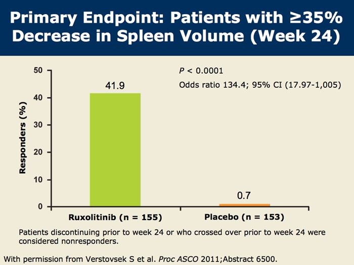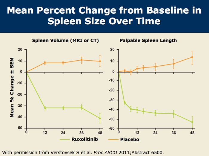 Verstovsek S et al. Results of COMFORT-I, a randomized double-blind phase III trial of JAK 1/2 inhibitor INCB18424 (424) versus placebo (PB) for patients with myelofibrosis (MF). Proc ASCO 2011;Abstract 6500. |