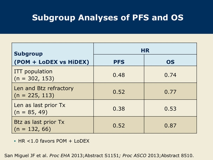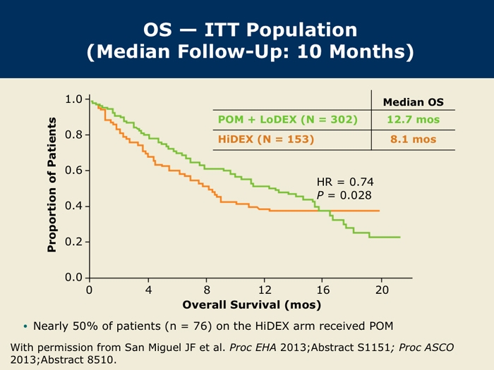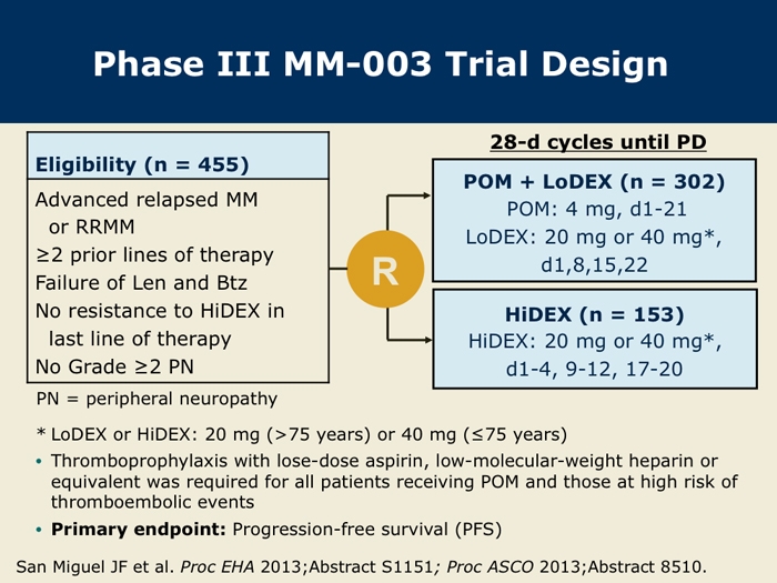 San Miguel JF et al. MM-003: A Phase III, multicenter, randomized, open-label study of pomalidomide (POM) plus low-dose dexamethasone (LoDEX) versus high-dose dexamethasone (HiDEX) in relapsed/refractory multiple myeloma (RRMM). Proc ASCO 2013; Abstract 8510.