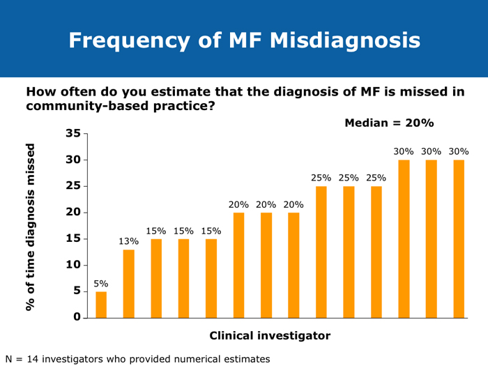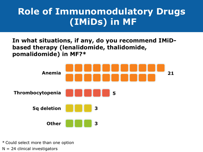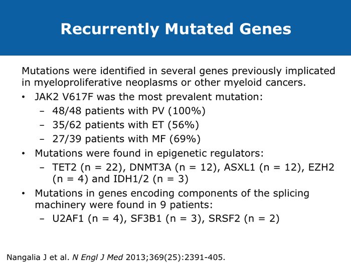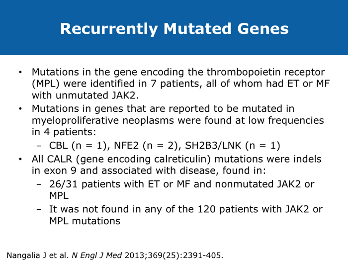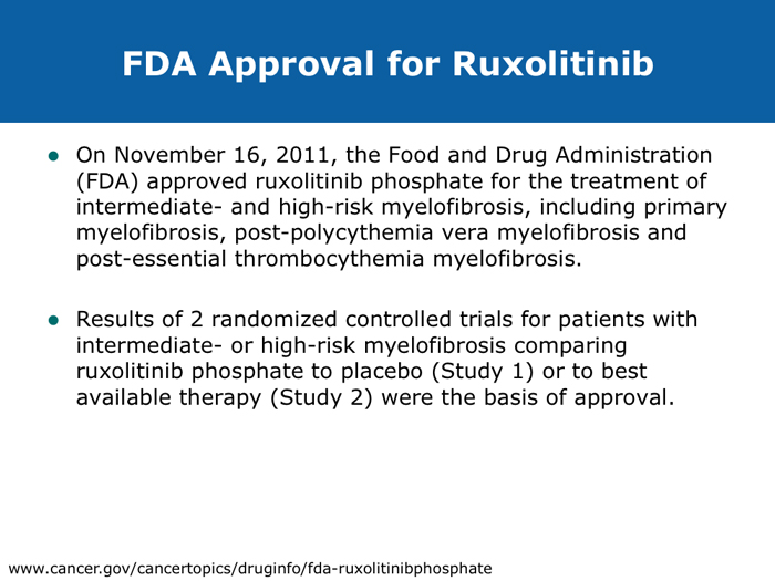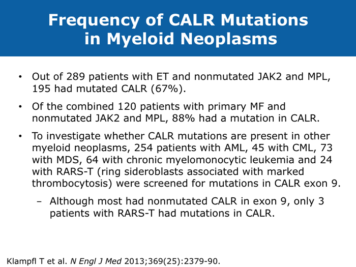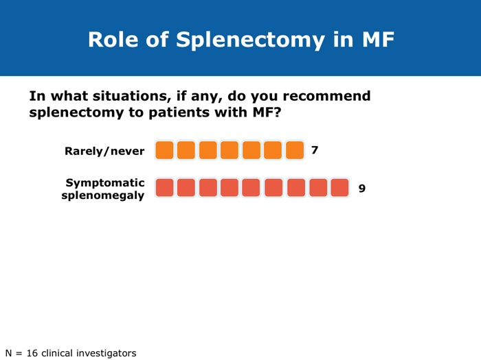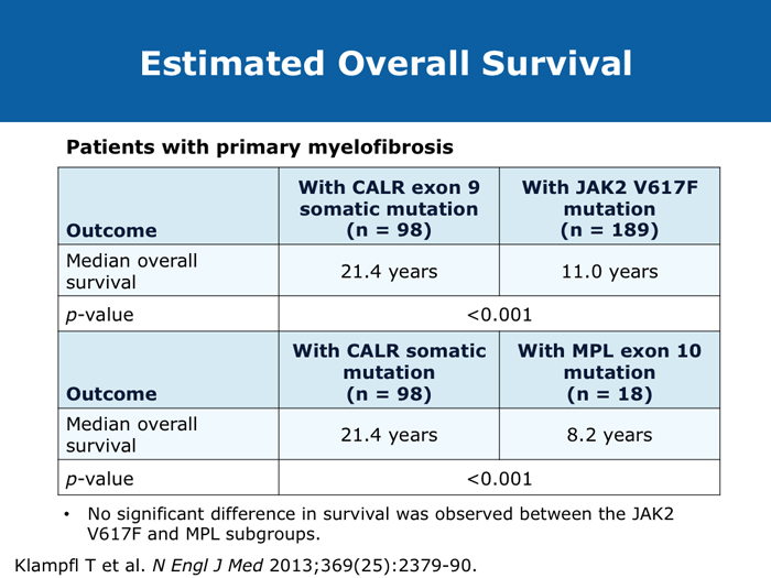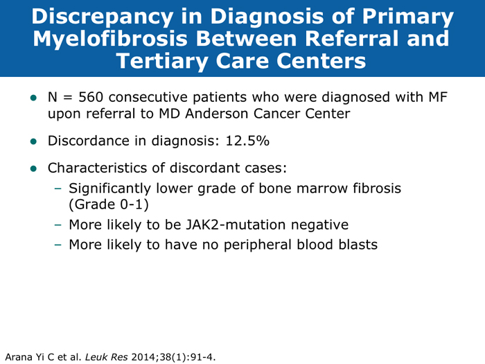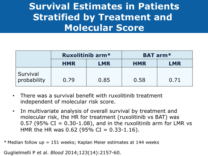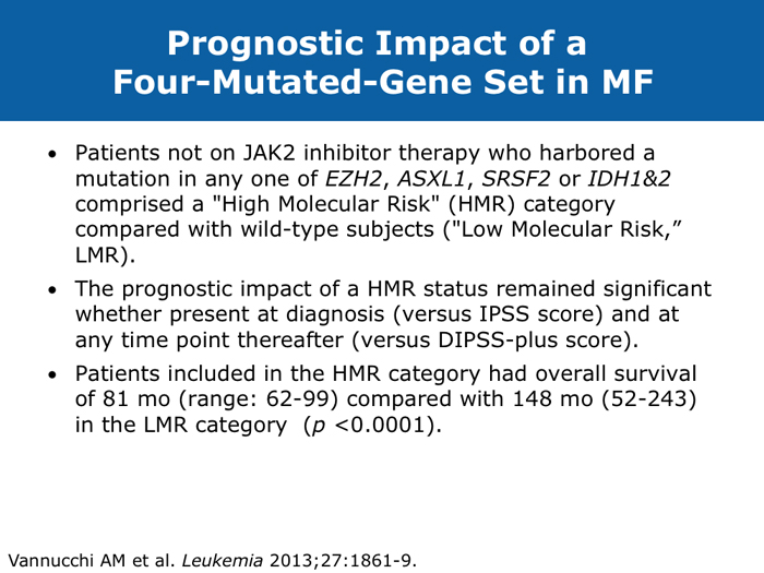 Dueck AC et al. Cytokine profile changes in 309 myelofibrosis patients: Comparison of JAK1/JAK2 inhibitor therapy vs placebo — Correlative analysis from the Comfort-I trial. Proc ASH 2013;Abstract 4074. Guglielmelli P et al; COMFORT-II Investigators; Associazione Italiana per la Ricerca sul Cancro Gruppo Italiano Malattie Mieloproliferative (AGIMM) Investigators. Impact of mutational status on outcomes in myelofibrosis patients treated with ruxolitinib in the COMFORT-II study. Blood 2014;123(14):2157-60. Abstract Guglielmelli P et al. EZH2 mutational status predicts poor survival in myelofibrosis. Blood 2011;118(19):5227-34. Abstract Klampfl T et al. Somatic mutations of calreticulin in myeloproliferative neoplasms. N Engl J Med 2013;369(25):2379-90. Abstract Kralovics R et al. A gain-of-function mutation of JAK2 in myeloproliferative disorders. N Engl J Med 2005;352(17):1779-90. Abstract Levine RL. Another piece of the myeloproliferative neoplasms puzzle. N Engl J Med 2013;369(25):2451-2. Abstract Nangalia J et al. Somatic CALR mutations in myeloproliferative neoplasms with nonmutated JAK2. N Engl J Med 2013;369(25):2391-405. Abstract Squires M et al. The relationship between cytokine levels and symptoms in patients (Pts) with myelofibrosis (MF) from COMFORT-II, a phase 3 study of ruxolitinib (RUX) vs best available therapy (BAT). Proc ASH 2013;Abstract 4070. Initial evaluation of a patient with MF should include cytogenetics if obtainable and formal assessment of international prognostic score (11 faculty)