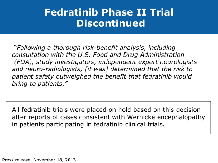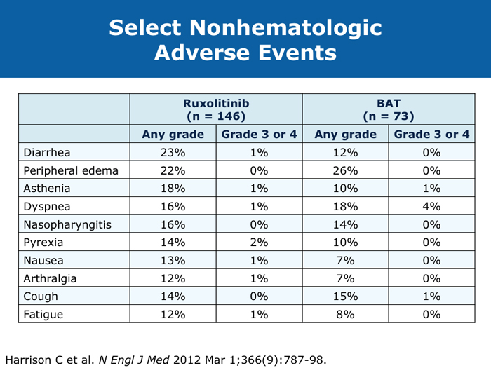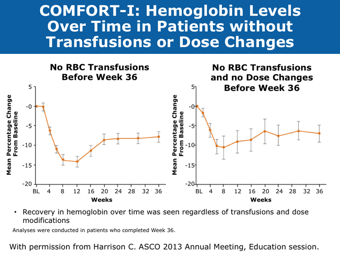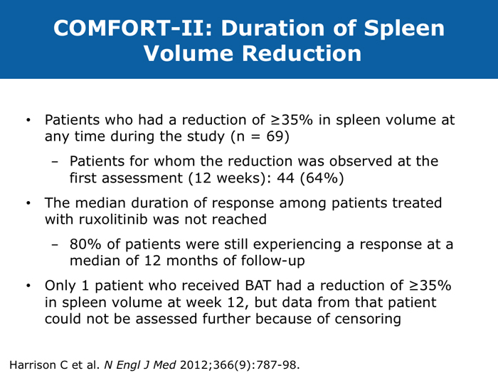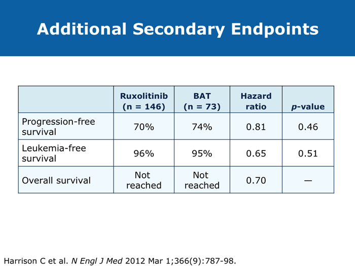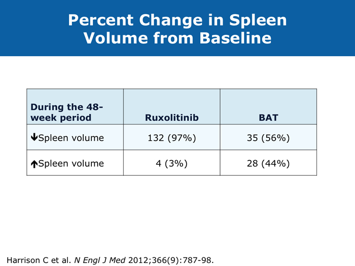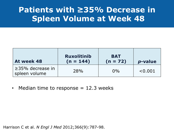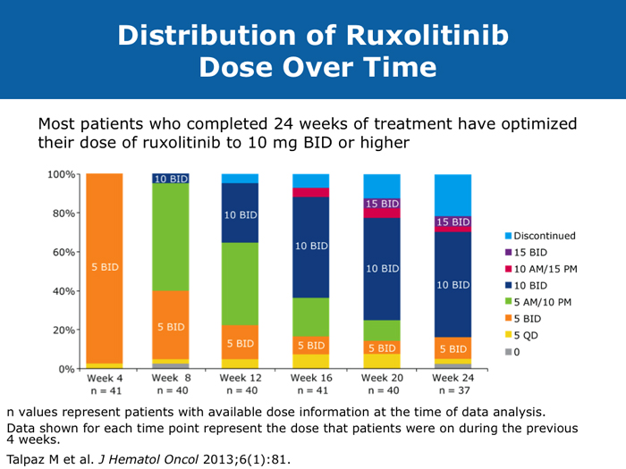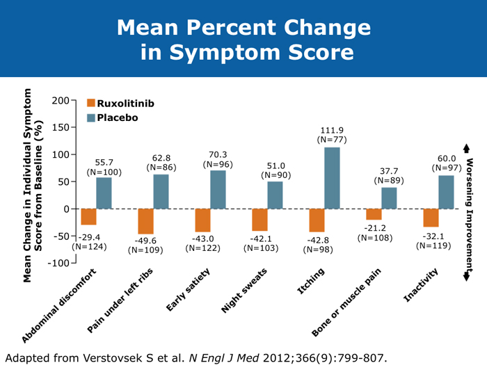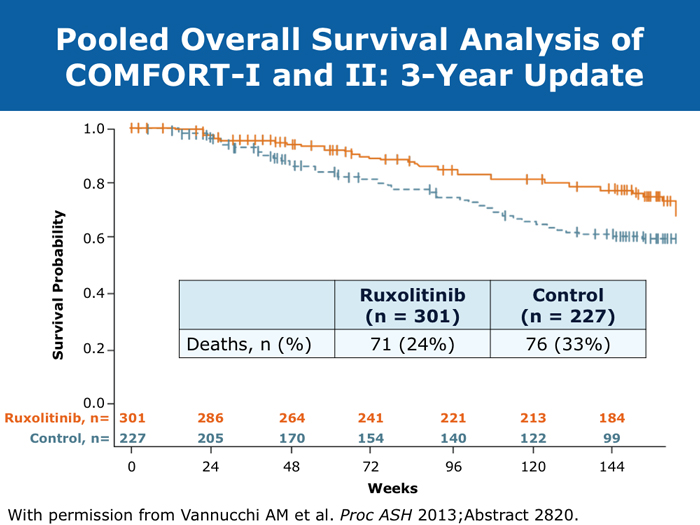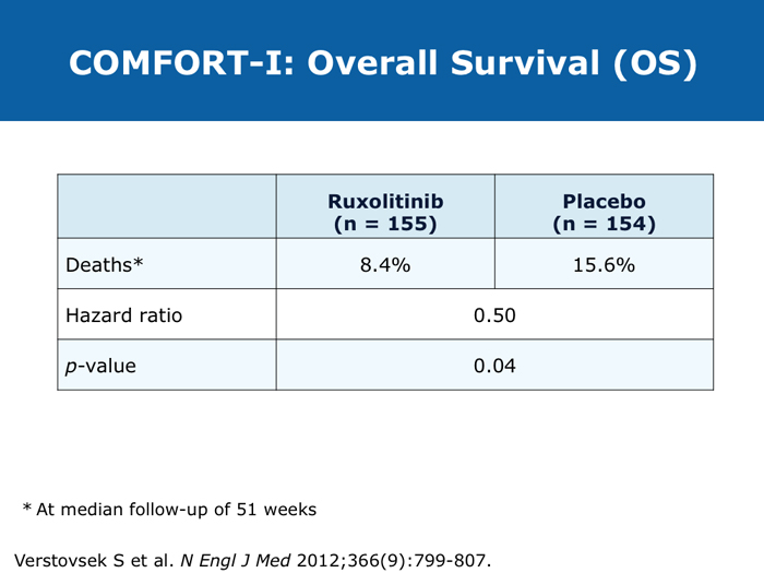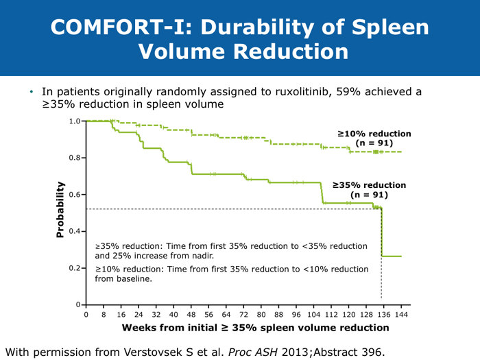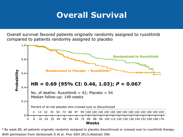 DR MESA: I believe it has an effect on slowing down the underlying cancer. Myelofibrosis is a glacial disease in certain ways. We are able to measure those features that are the most apparent and immediate, such as splenic symptoms, and then with time perhaps we can measure a delay in the progression of the disease. We’ve noted improvements in survival, and it seems that some patients derive long-term benefit. I believe we have a tendency to underestimate the benefits of ruxolitinib simply because the immediate effects are so obvious.