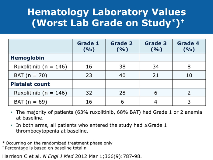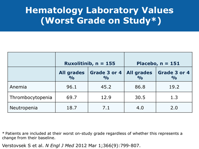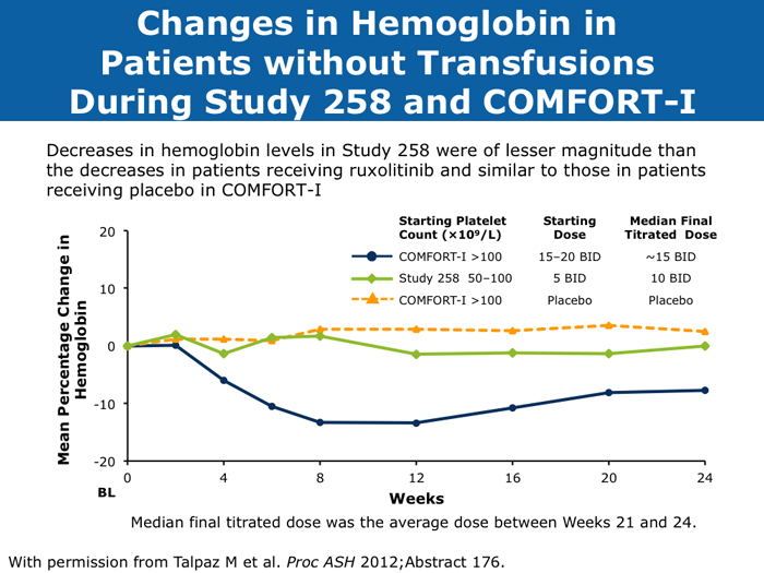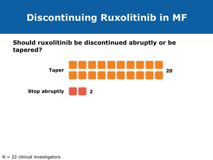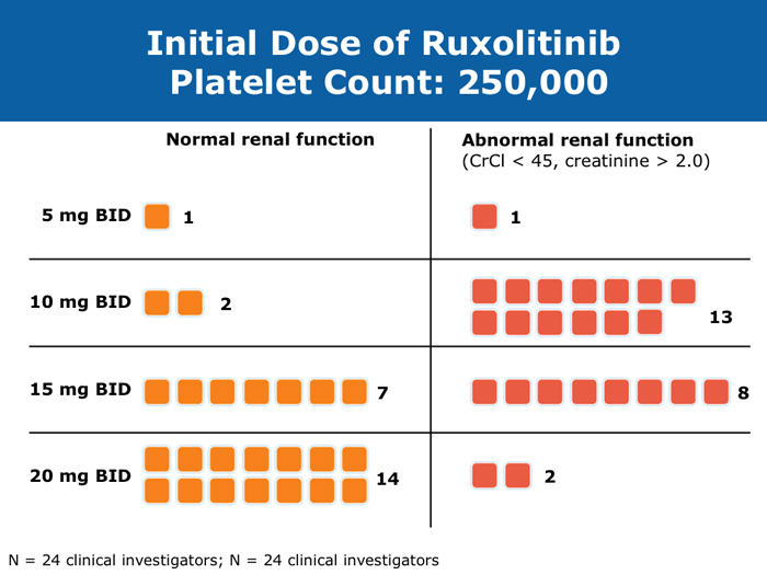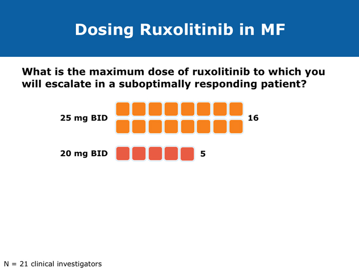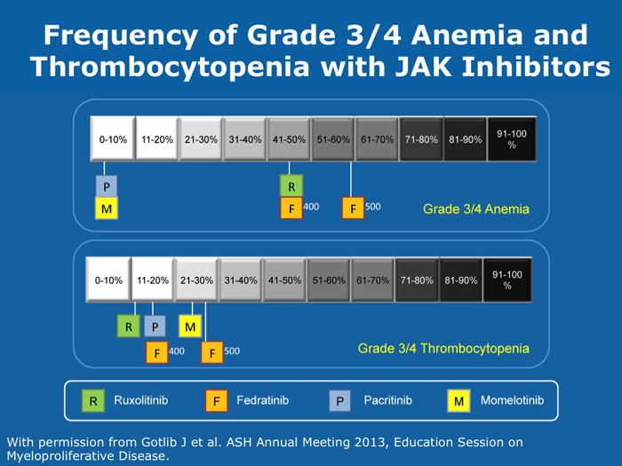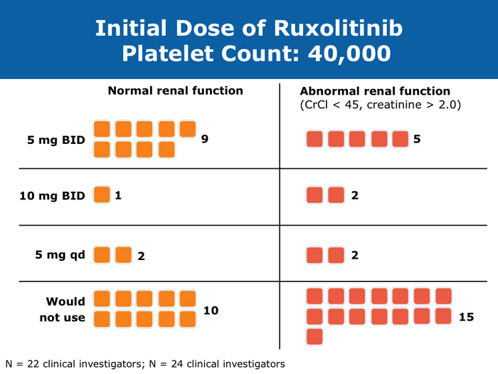 Jason Gotlib, MD, MS![]() DR GOTLIB: If patients develop anemia after starting ruxolitinib, it usually occurs by the end of the first month, not during the first week or two. If their hemoglobin drops from 11 to 9 g/dL, that doesn’t cause concern as long as they are not experiencing more fatigue. If their hemoglobin decreases from 10 to <8 g/dL and they are complaining of tiredness, that requires assessing the balance between the improvement in symptoms that they experience with ruxolitinib, which is often dramatic, and the fatigue. I discuss the possibility of transfusion with patients. If they undergo transfusion and the hemoglobin remains low and they are still tired, then I consider reducing the dose of ruxolitinib. If I started them at 20 mg BID, then I’ll reduce the dose to 15 mg BID. I monitor them, and if the hemoglobin starts to rise, then I consider dose escalation. If the patient continues to need transfusions, then I explore adding another agent, such as epoetin alfa or darbepoetin alfa, to ruxolitinib. Ruben A Mesa, MD![]() DR MESA: In practice anemia is probably the largest issue with ruxolitinib use. Hemoglobin level is the most significant driver of how we initially dose ruxolitinib. The natural cutoffs would be hemoglobin levels of 10 g/dL and lower, hemoglobin levels of 8 to 10 g/dL and transfusion dependence. For patients who are not anemic, the highest dose of ruxolitinib that I would start with is 15 mg BID. For patients with a hemoglobin level lower than 10 g/dL, I would administer 10 mg BID of ruxolitinib. If a patient is transfusion dependent, we typically start at 5 mg BID and increase the dose. I tend to make my decision about the starting dose and “ride it out” for the first 3 months. Jumping around with dose reductions in the first several weeks is probably not ideal. I consider anemia to be a somewhat known, expected and sometimes transient toxicity associated with ruxolitinib. If I’ve made the commitment to try the medication for the patient’s benefit, I don’t adjust the dose in the first few weeks simply because of anemia. Srdan Verstovsek, MD, PhD![]() DR VERSTOVSEK: When you administer ruxolitinib at the recommended dose, approximately one quarter of patients develop significant anemia. Proactive monitoring during the first couple of months, when anemia is known to occur, and avoiding treatment interruptions are important because maintaining the exposure to ruxolitinib is ideal. If you stop treatment, the symptoms come back within 10 days. If you see patients only once a month, a patient might develop significant myelosuppression. At that point the physician may say, “Oh. Now he’s too low. We’ll stop ruxolitinib.” Then all the benefits will be lost. The better way would be to decrease the dose and administer a transfusion. Another transfusion may be needed in 2 weeks, but then the red blood cell count will have rebounded because you lowered the ruxolitinib dose and the benefit is not lost. For example, for a symptomatic patient with a hemoglobin level of about 10 g/dL and a platelet count of 220K/µL who was started on 20 mg BID of ruxolitinib but developed anemia after 2 weeks of therapy, I would dose reduce to 10 mg BID and perform a blood transfusion. A proactive decrease and an acceptance of occasional transfusions while patients are recovering at the lower dose are desirable because of the rebound in the red blood cell count. Guglielmelli P, Vannucchi AM. Struggling with myelofibrosis-associated anemia. Leuk Res 2013;37(11):1429-31. Abstract Mascarenhas J et al. An open-label, phase II study of the JAK1 inhibitor INCB039110 in patients with myelofibrosis. Proc ASH 2013;Abstract 663. Mesa R et al. Optimizing dose titration of ruxolitinib: The COMFORT-I experience. Proc ASH 2013;Abstract 4062. Pardanani A et al. Update on the long-term efficacy and safety of momelotinib, a JAK1 and JAK2 inhibitor, for the treatment of myelofibrosis. Proc ASH 2013;Abstract 108. Tabarroki A, Tiu RV. Immunomodulatory agents in myelofibrosis. Expert Opin Investig Drugs 2012;21(8):1141-54. Abstract Verstovsek S et al. Long-term outcomes of ruxolitinib therapy in patients with myelofibrosis: 3-year update from COMFORT-I. Proc ASH 2013;Abstract 396. Select patients with platelet counts as low as 50,000 can successfully receive treatment with a cautious dose-escalation approach (10 faculty)
