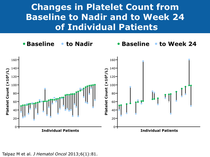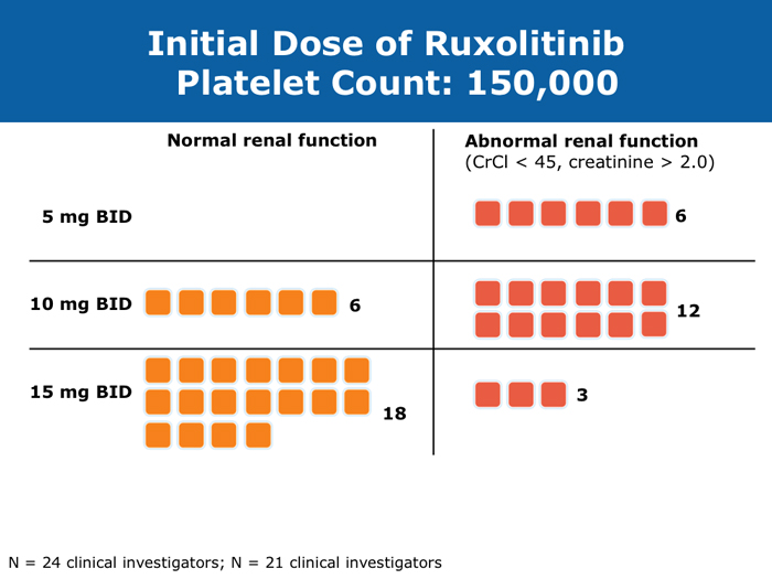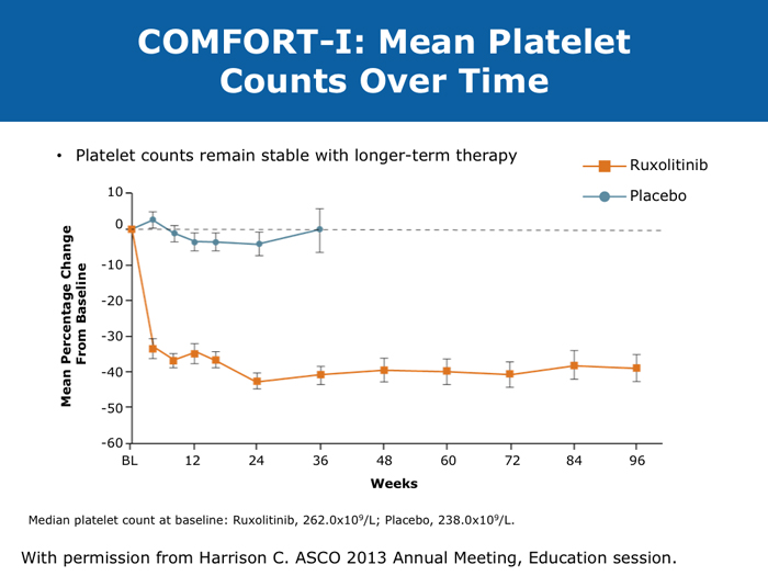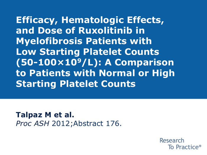 Moshe Talpaz, MD![]() DR TALPAZ: Both the COMFORT-I and COMFORT-II studies were open to patients with platelet counts over 100,000/µL. At ASH 2012 I presented the results of Study 258, which used a starting dose of 5 mg BID of ruxolitinib and allowed escalation based on platelet counts at monthly intervals for all patients. We included patients with platelet counts of 50 to 100K/µL, which means moderate — 50 to 75K/µL platelets — and mild — 75 to 100K/µL platelets — thrombocytopenia. The take-home message from the study was that the vast majority of patients can receive treatment if they have platelets at the starting point of that range between 50 and 100K/µL, and the average patient ended up receiving 10 mg BID. The responses were slightly lower than the ones observed in the COMFORT-I and COMFORT-II trials but not dramatically lower. About 35% of the patients still experienced a reduction in spleen volume to a level of partial response, and about 40% of the patients experienced a 50% or higher reduction in symptoms. Another benefit was much less prominent anemia. A second interesting finding is that a quarter of the patients with thrombocytopenia may exhibit a splenic sequestration phenomenon, especially if they have early-stage disease. Paradoxically, their platelet counts increased instead of decreasing and they responded beautifully. You need to be aware of this patient group with relatively early disease and those with intermediate-1 or low-risk disease whose low platelet count may be reversed with ruxolitinib. A third observation is that the drop in platelets is highly predictable, usually about 20 to 30K/µL, so you can plan for this. If a patient starts with 50K/µL, then you’ll require treatment interruptions. If a patient starts with platelet counts between 50 and 100K/µL, you usually don’t need to interrupt treatment. It’s predictable. I have administered ruxolitinib to patients with platelet counts lower than 50K/µL. However, the concern is that most of these patients already have damaged bone marrow. They have low cellularity and heavy fibrosis, and the platelet counts continue to drop. So I suggest checking the bone marrow and the cellularity first and being careful not to administer a myelosuppressive treatment to patients with an extremely low bone marrow cellularity of 30% or less. It will not be beneficial. John O Mascarenhas, MD![]() DR MASCARENHAS: It’s well established from the COMFORT-I and COMFORT-II studies that patients with platelet counts higher than 100K/µL can receive ruxolitinib. According to data presented from Study 258, it is also feasible to administer ruxolitinib to patients with platelet counts of 50 to 100K/µL. My recommendation is to start low and titrate upward. I wouldn’t recommend starting ruxolitinib when the platelet count is lower than 50K/µL. With a platelet count of 50 to 100K/µL, I start at 5 mg BID and slowly increase on a monthly basis. At times I titrate up so that the patient receives 5 mg in the morning and 10 mg in the evening. I adopt a stepwise and careful approach. With platelet counts of 100 to 150K/µL, I tend to use 10 mg BID. I follow up with these patients weekly for the first 1 to 2 months to avoid abrupt cessation of the agent. Typically, within the first month of beginning ruxolitinib their platelet counts will give you a sense of whether you will be able to maintain the dose or how quickly you may need to reduce it. Harrison C et al. Expand: A phase 1b, open-label, dose-finding study of ruxolitinib in patients with myelofibrosis and baseline platelet counts between 50 × 109/L and 99 × 109/L. Proc ASH 2012;Abstract 177. Mesa R et al. Optimizing dose titration of ruxolitinib: The COMFORT-I experience. Proc ASH 2013;Abstract 4062. Talpaz M et al. Interim analysis of safety and efficacy of ruxolitinib in patients with myelofibrosis and low platelet counts. J Hematol Oncol 2013;6(1):81. Abstract Verstovsek S et al. Long-term outcomes of ruxolitinib therapy in patients with myelofibrosis: 3-year update from COMFORT-I. Proc ASH 2013;Abstract 396. Clinical disease progression doesn’t necessarily mandate stoppage of JIs