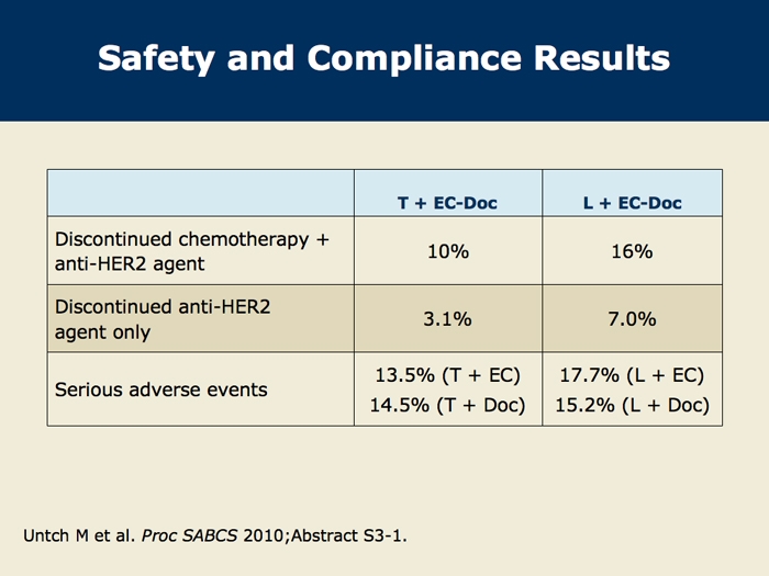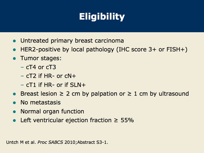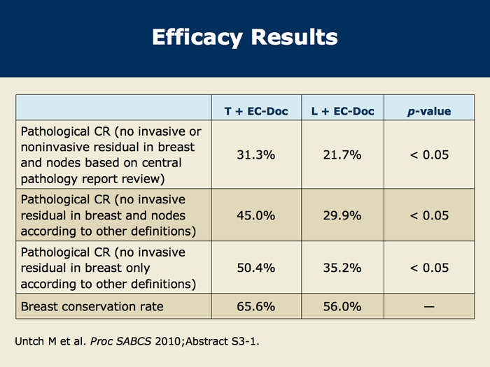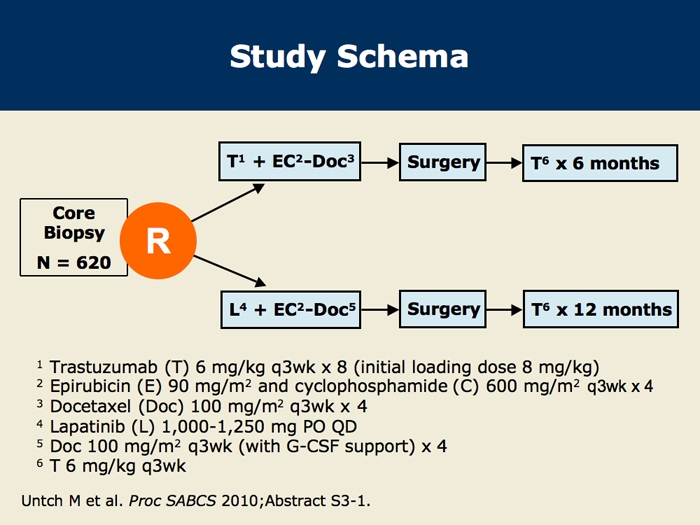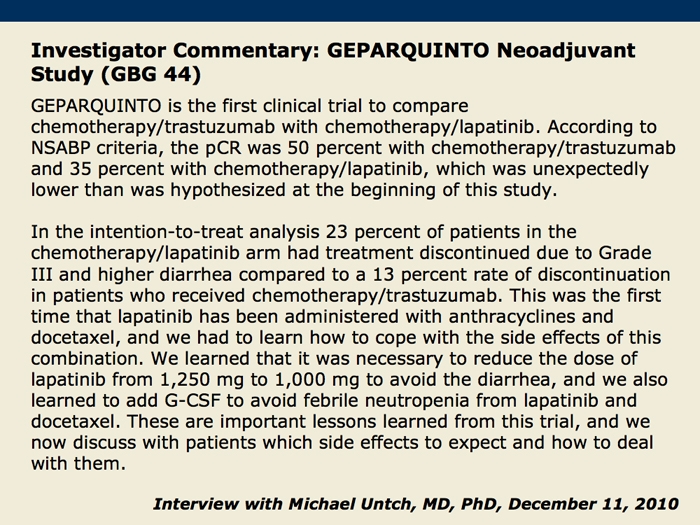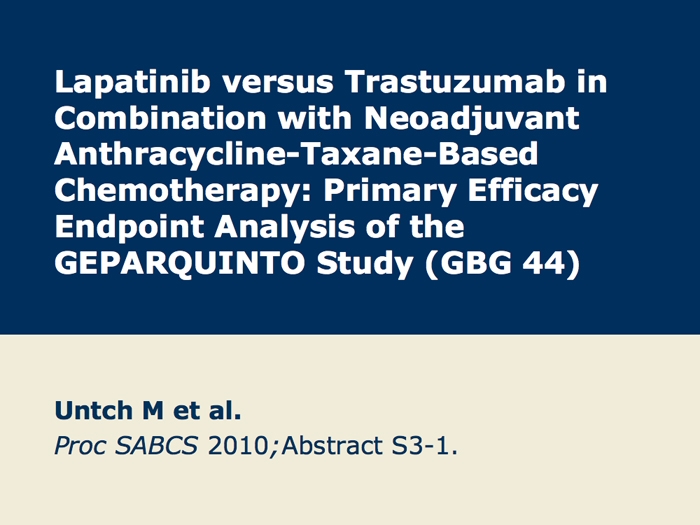 Untch M et al. Lapatinib versus trastuzumab in combination with neoadjuvant anthracycline-taxane-based chemotherapy: Primary efficacy endpoint analysis of the GEPARQUINTO study (GBG 44). San Antonio Breast Cancer Symposium 2010;Abstract S3-1.
