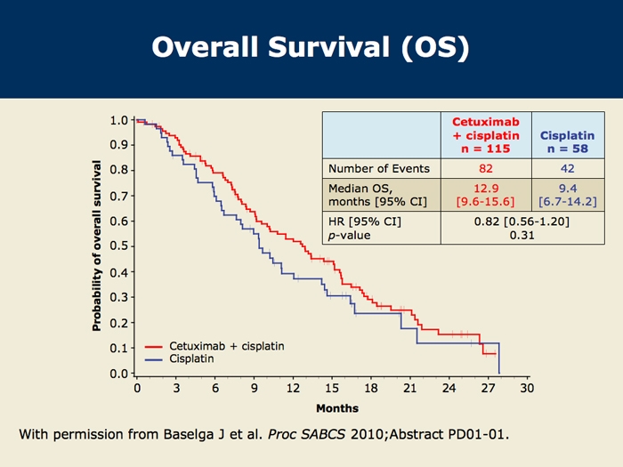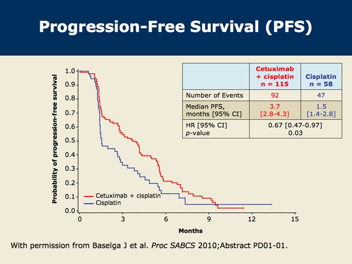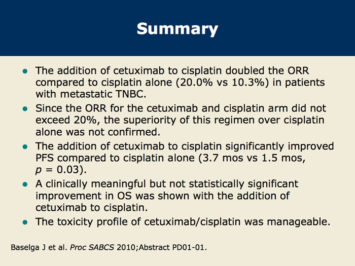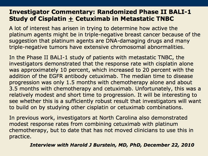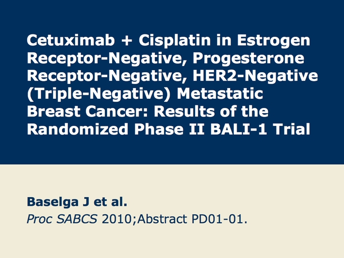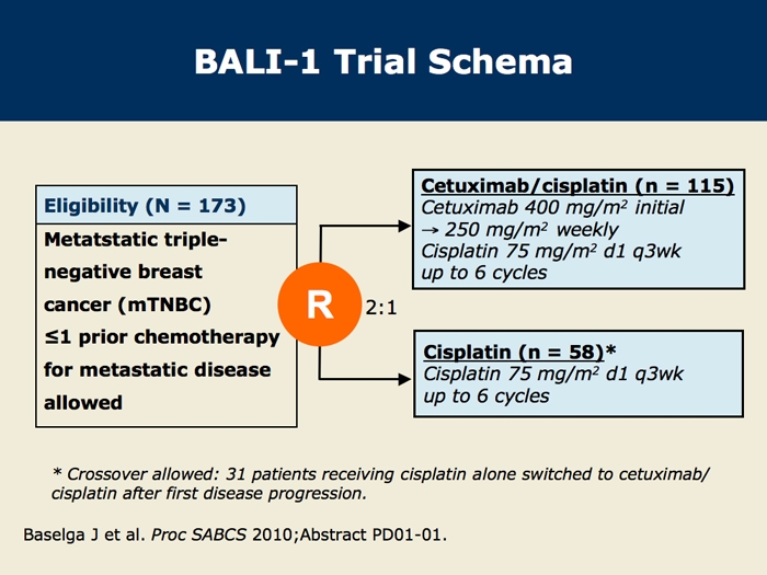 Baselga J et al. Cetuximab + cisplatin in estrogen receptor-negative, progesterone receptor-negative, HER2-negative (triple-negative) metastatic breast cancer: Results of the randomized phase II BALI-1 trial. San Antonio Breast Cancer Symposium 2010;Abstract PD01-01.