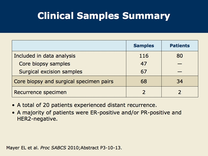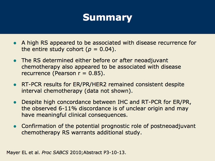 Mayer EL et al. Prognostic value of genomic analysis after neoadjuvant chemotherapy for breast cancer. San Antonio Breast Cancer Symposium 2010;Abstract P3-10-13.