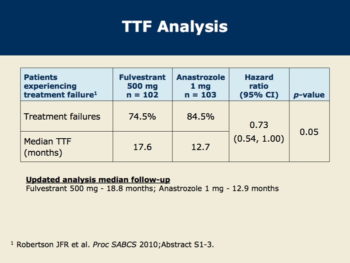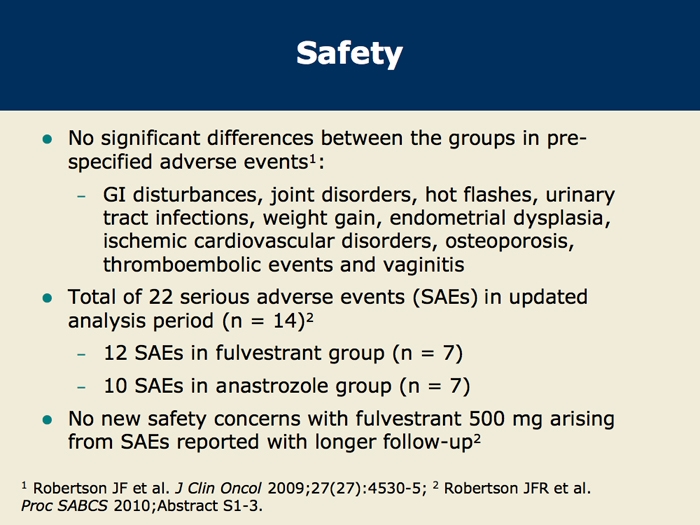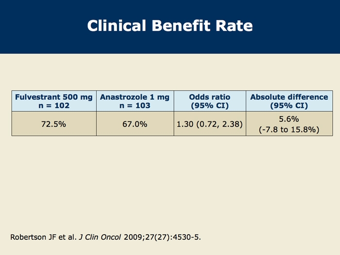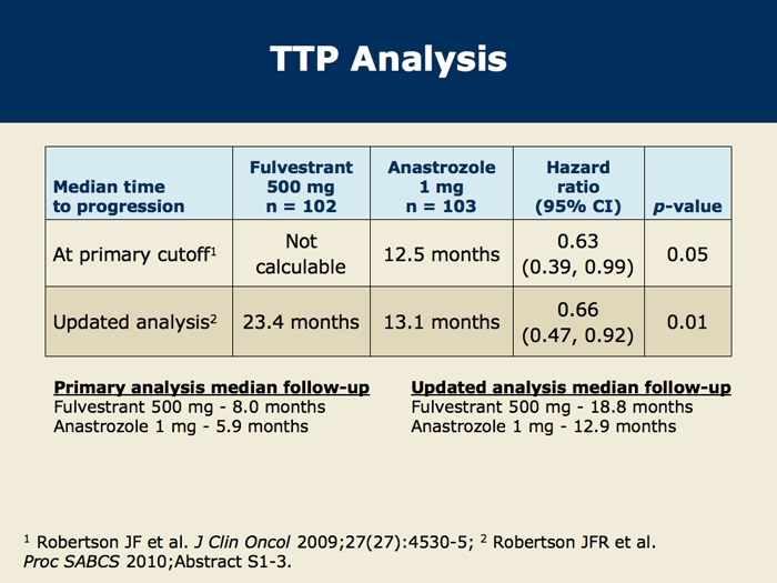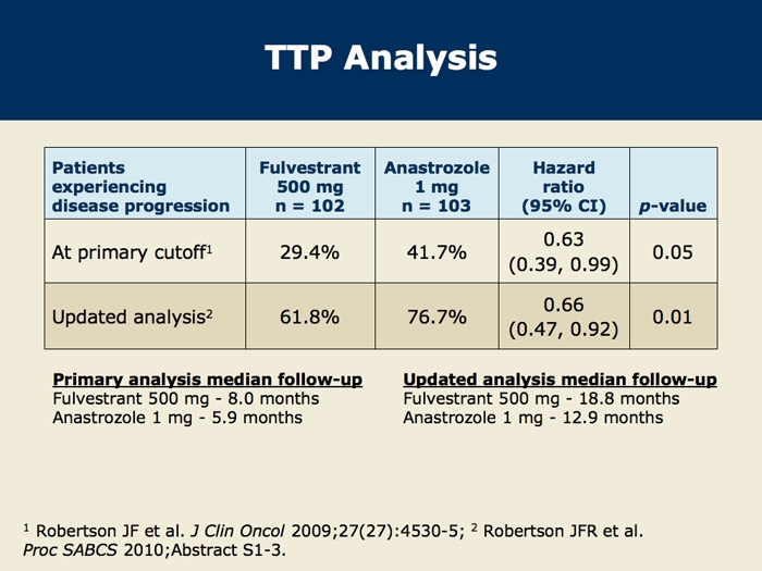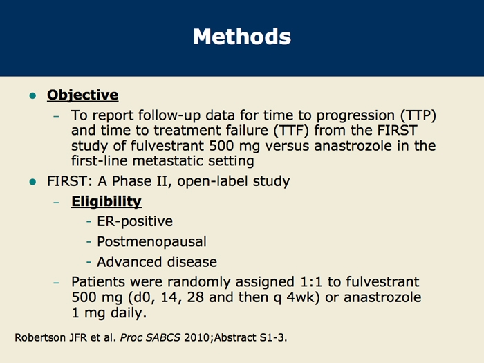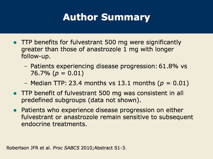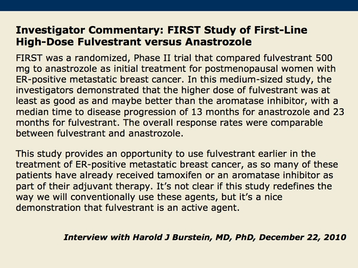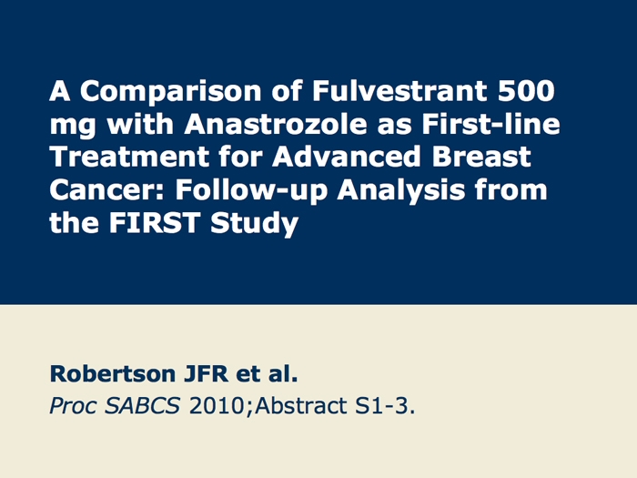 Robertson JFR et al. A comparison of fulvestrant 500 mg with anastrozole as first-line treatment for advanced breast cancer: Follow-up analysis from the FIRST study. San Antonio Breast Cancer Symposium 2010;Abstract S1-3.