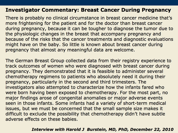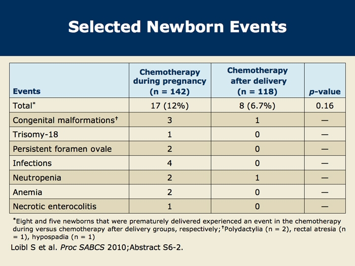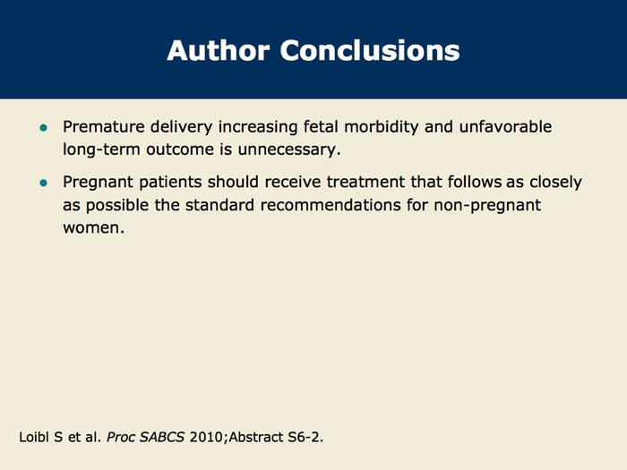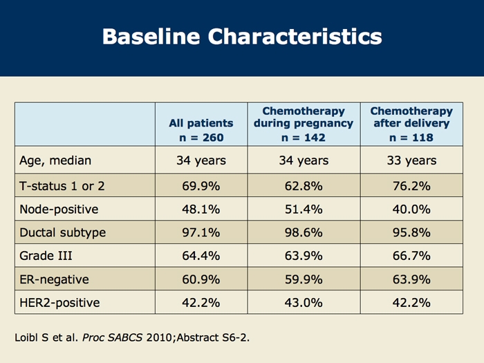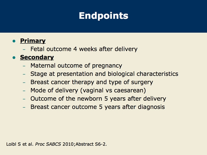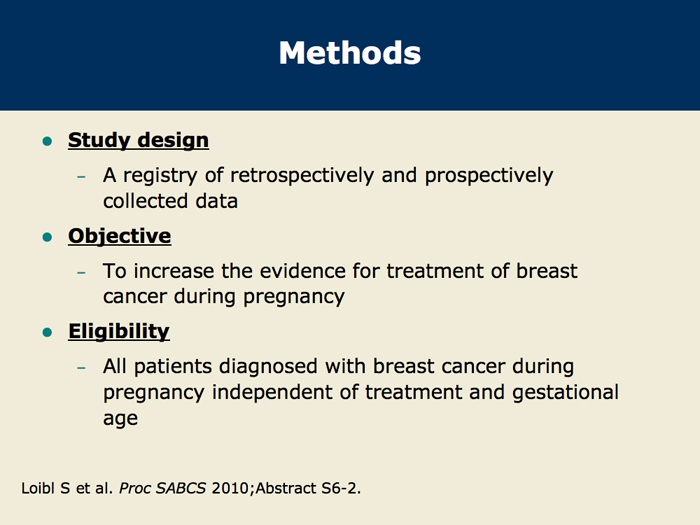 Loibl S et al. Patients with breast cancer during pregnancy — Results from a prospective and retrospective registry (GBG-20/BIG02-03). San Antonio Breast Cancer Symposium 2010;Abstract S6-2.