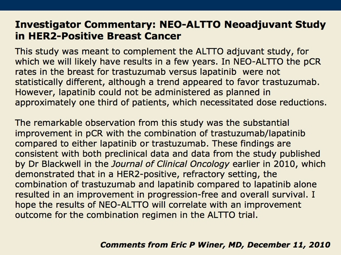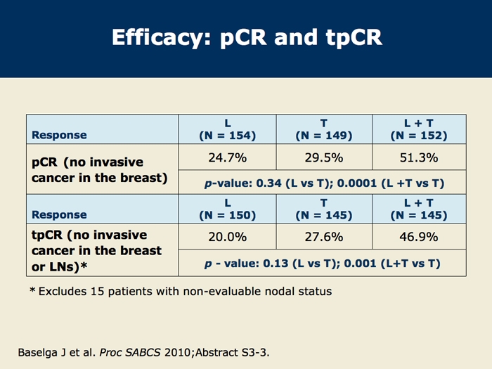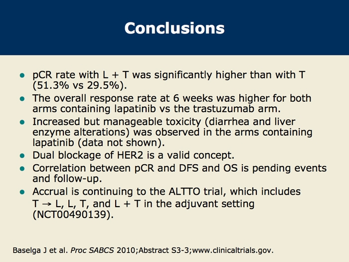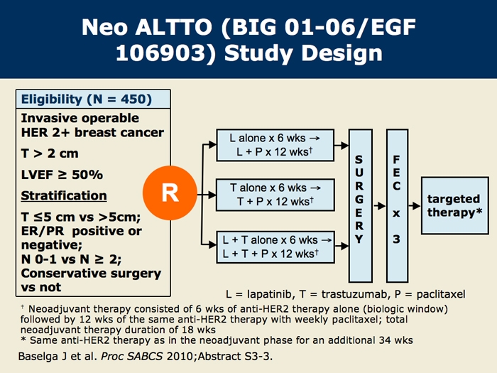 Baselga J et al. First results of the NeoALTTO trial (BIG 01-06/EGF 106903): A phase III, randomized, open label, neoadjuvant study of lapatinib, trastuzumab, and their combination plus paclitaxel in women with HER 2-positive primary breast cancer. San Antonio Breast Cancer Symposium 2010;Abstract S3-3.