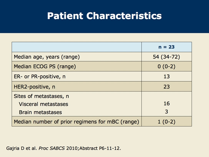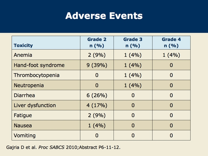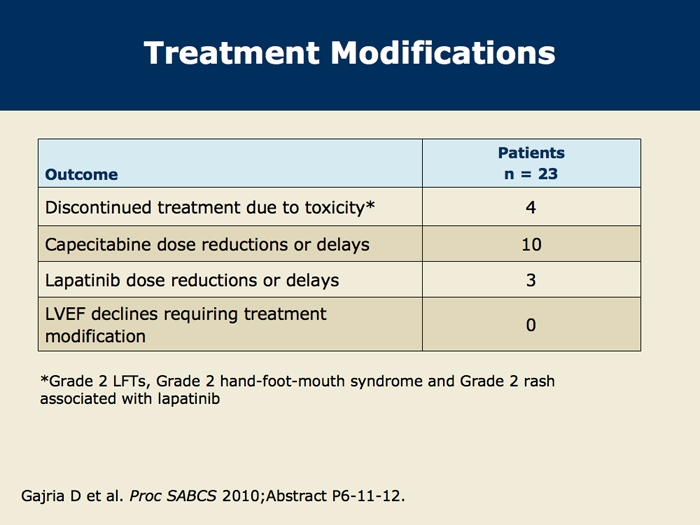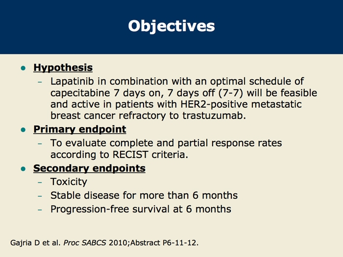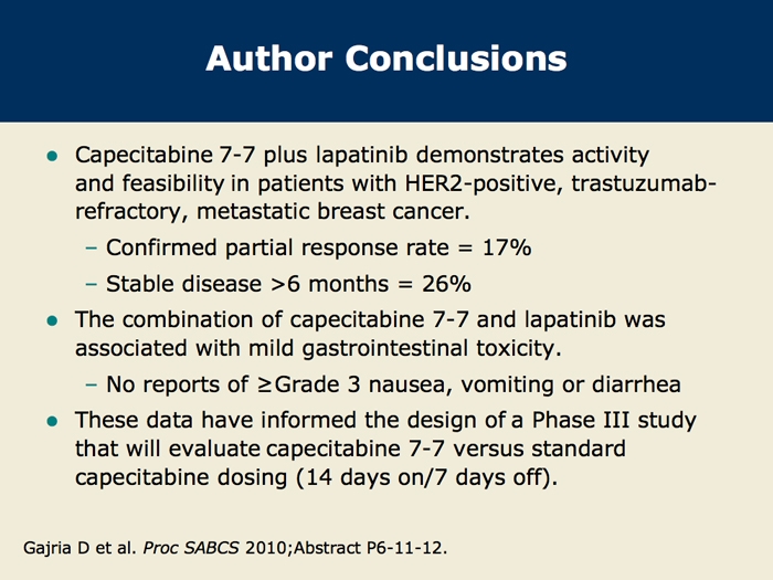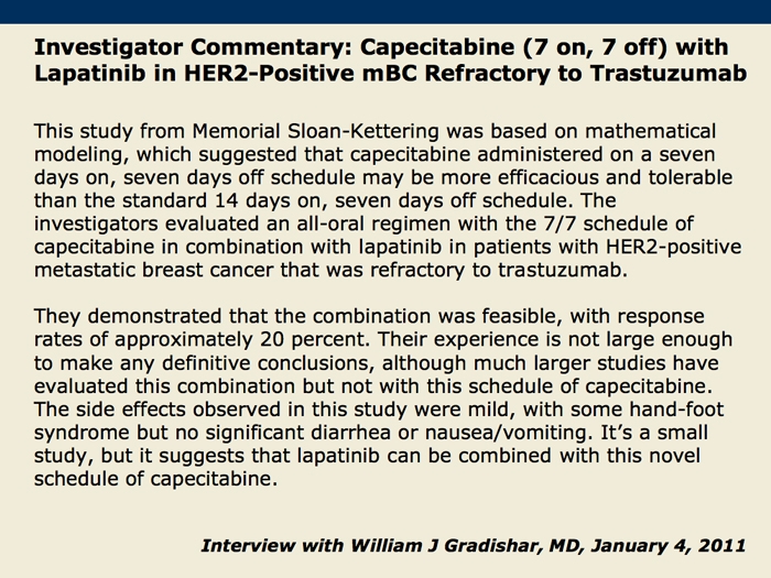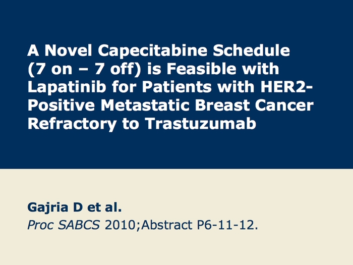 Gajria D et al. A novel capecitabine schedule (7 on — 7 off) is feasible with lapatinib for patients with HER2-positive metastatic breast cancer refractory to trastuzumab. San Antonio Breast Cancer Symposium 2010;Abstract P6-11-12.