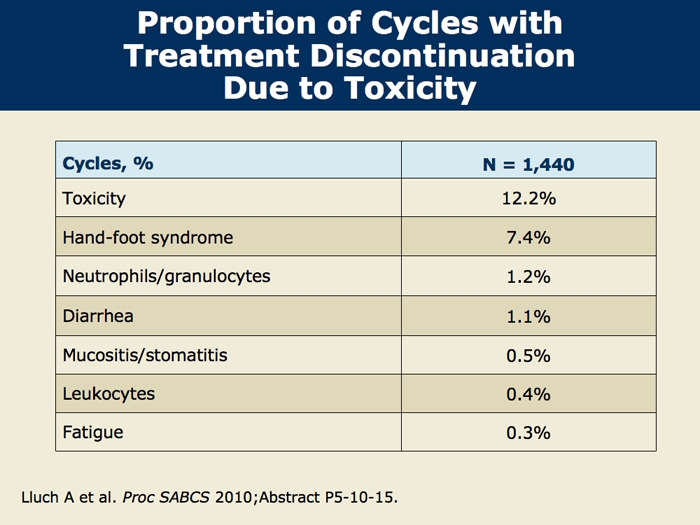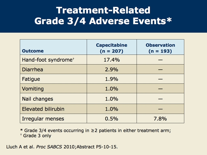 Lluch A et al. First safety data from a randomized Phase III (CIBOMA 2004-01/GEICAM 2003-11) trial assessing adjuvant capecitabine maintenance therapy after standard chemotherapy for triple-negative early breast cancer. San Antonio Breast Cancer Symposium 2010;Abstract P5-10-15.