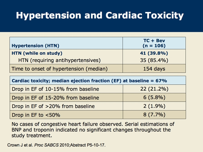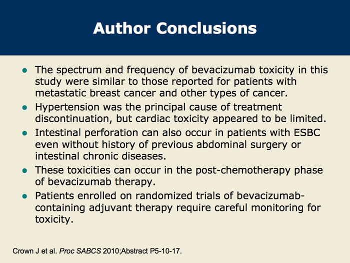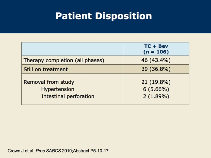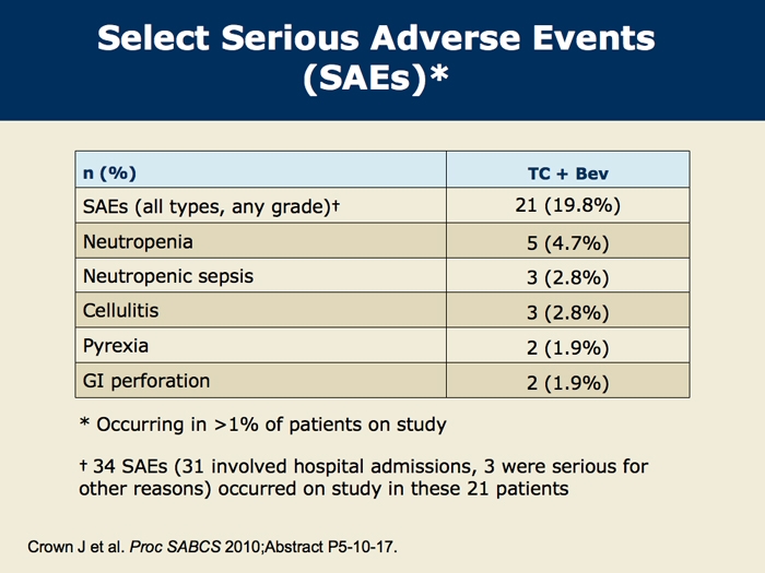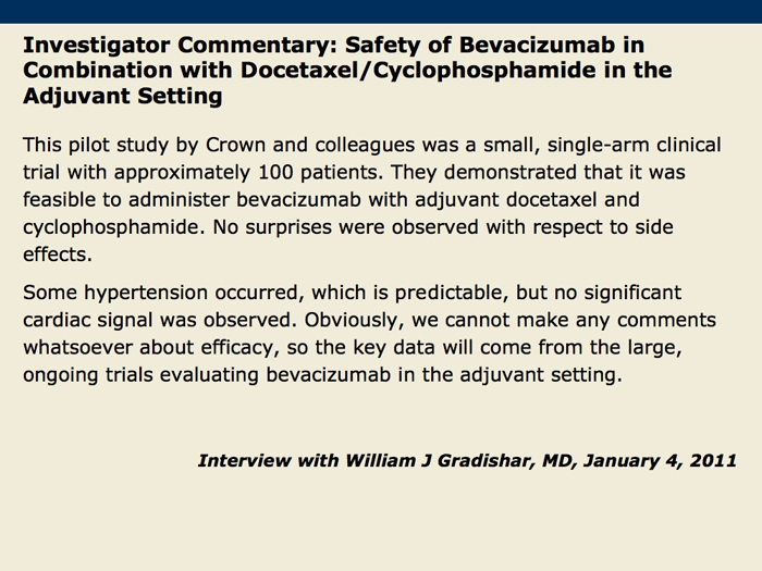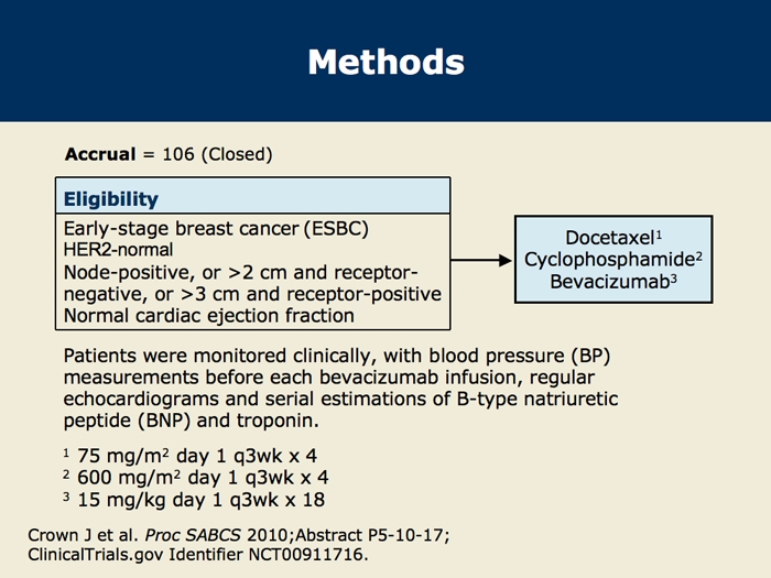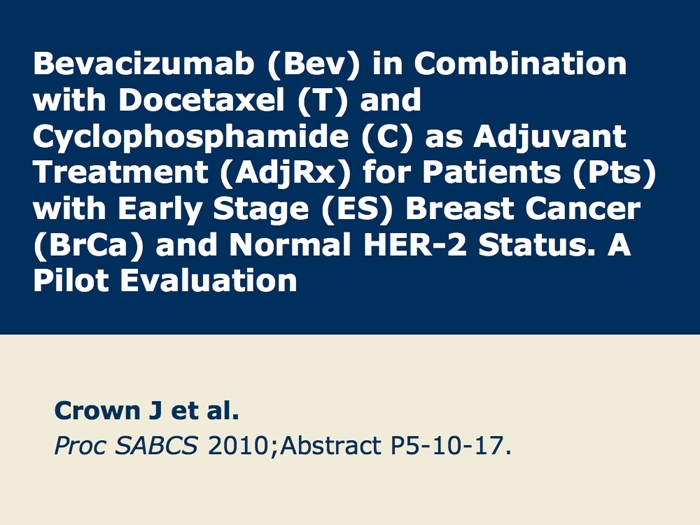 Crown J et al. Bevacizumab (Bev) in combination with docetaxel (T) and cyclophosphamide (C) as adjuvant treatment (AdjRx) for patients (pts) with early stage (ES) breast cancer (BrCa) and normal HER-2 status. A pilot evaluation. San Antonio Breast Cancer Symposium 2010;Abstract P5-10-17.