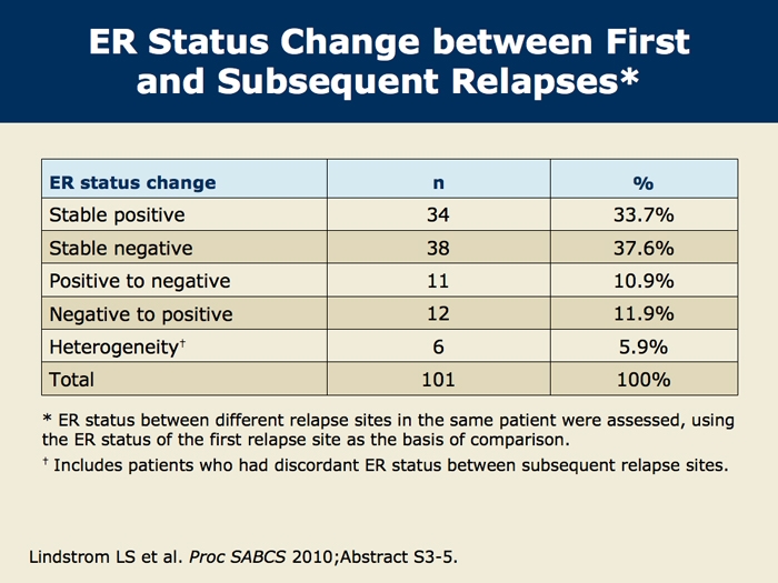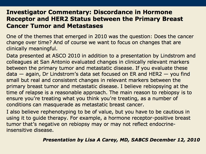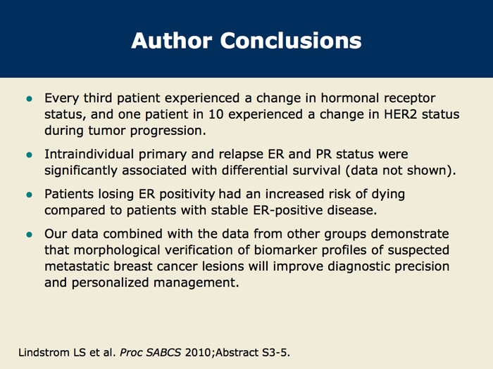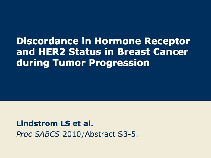 Lindstrom LS et al. Discordance in hormone receptor and HER2 status in breast cancer during tumor progression. San Antonio Breast Cancer Symposium 2010;Abstract S3-5.