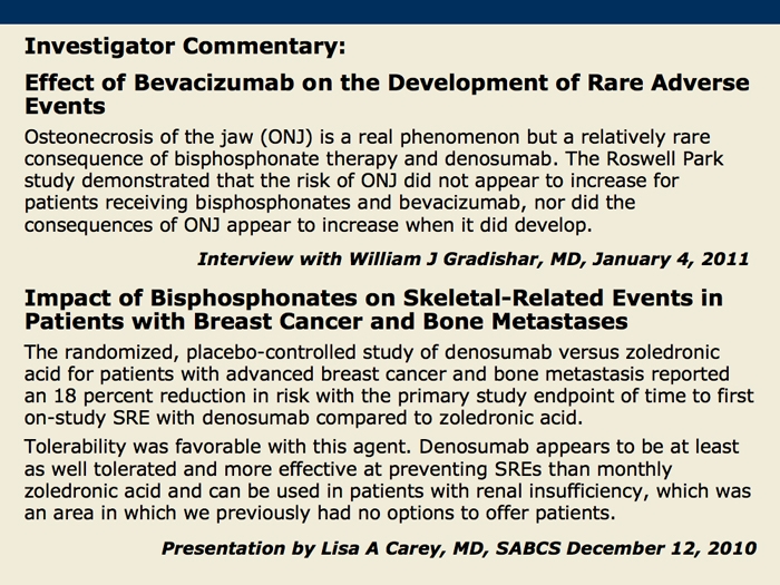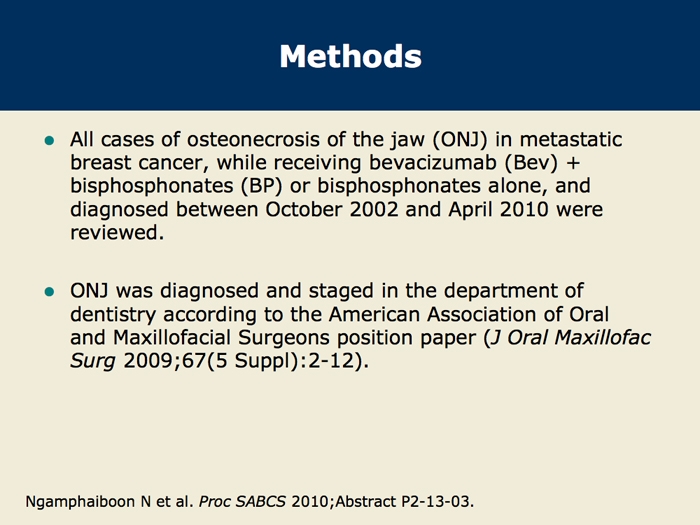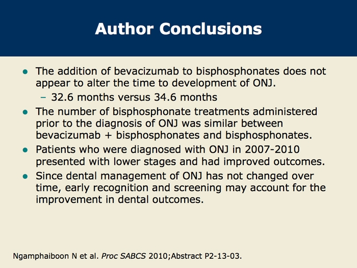 Ngamphaiboon N et al. Osteonecrosis of the jaw: Dental outcomes in metastatic breast cancer patients treated with bisphosphonates with/without bevacizumab at Roswell Park Cancer Institute. San Antonio Breast Cancer Symposium 2010; Abstract P2-13-03.