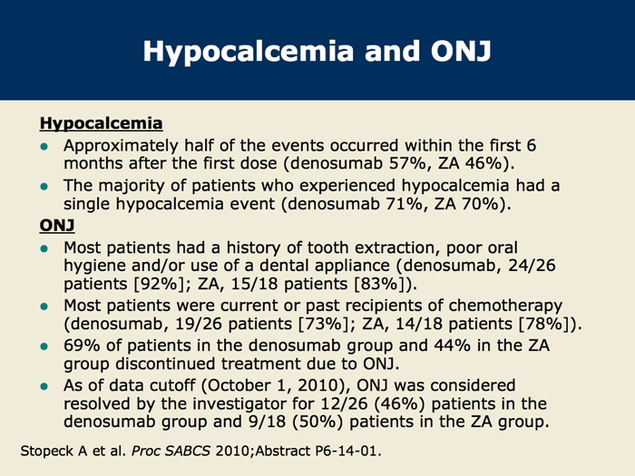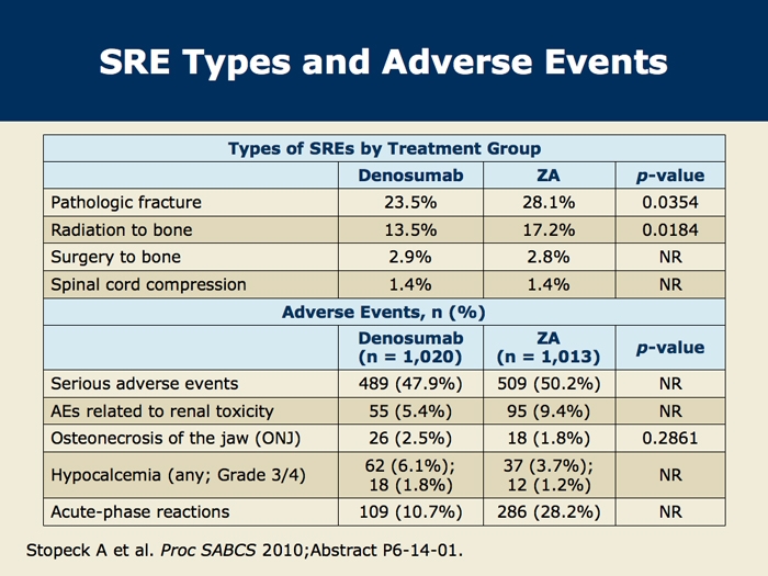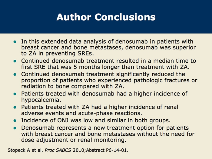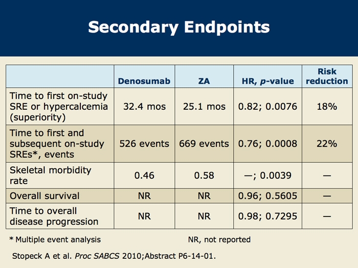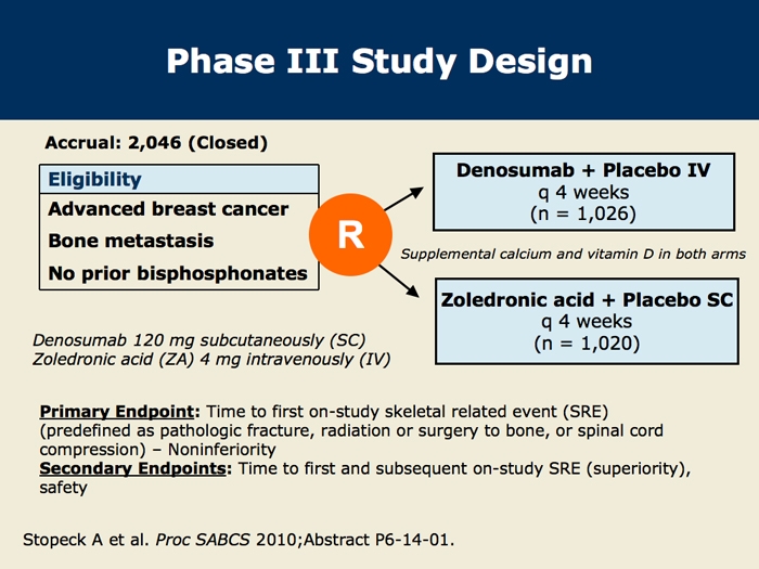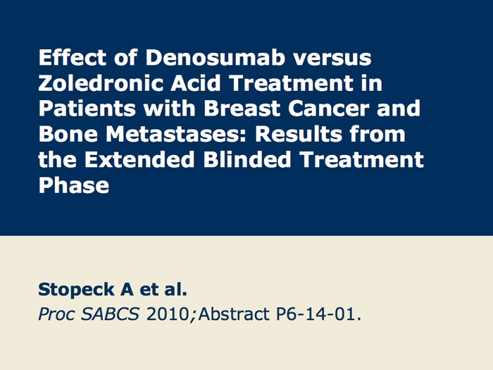 Stopeck A et al. Effect of denosumab versus zoledronic acid treatment in patients with breast cancer and bone metastases: Results from the extended blinded treatment phase. San Antonio Breast Cancer Symposium 2010; Abstract P6-14-01.