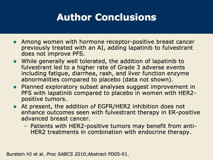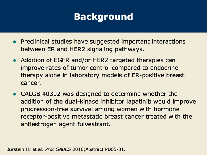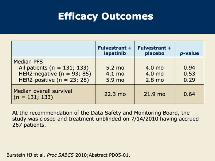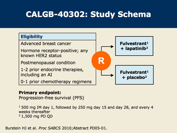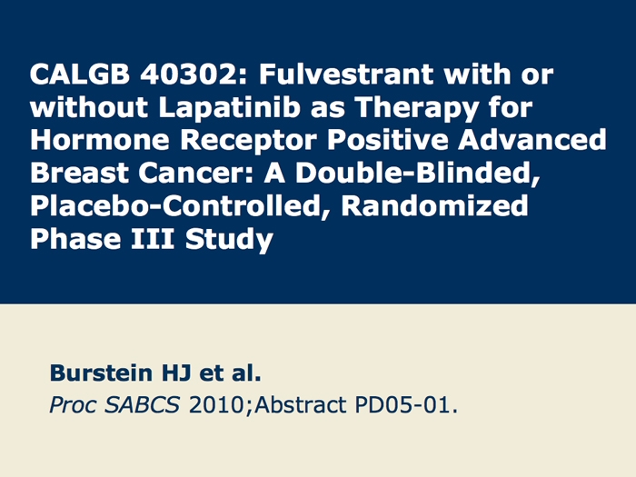Burstein HJ et al. CALGB 40302: Fulvestrant with or without lapatinib as therapy for hormone receptor positive advanced breast cancer: A double-blinded, placebo-controlled, randomized phase III study. San Antonio Breast Cancer Symposium 2010; Abstract PD05-01.