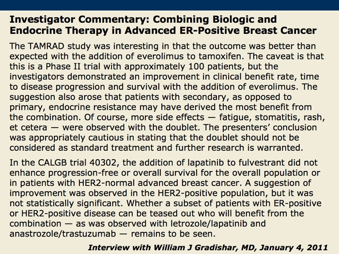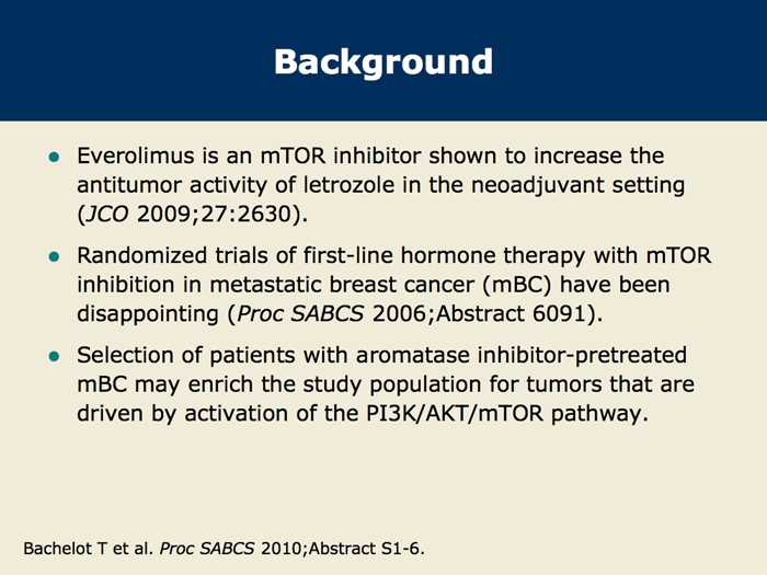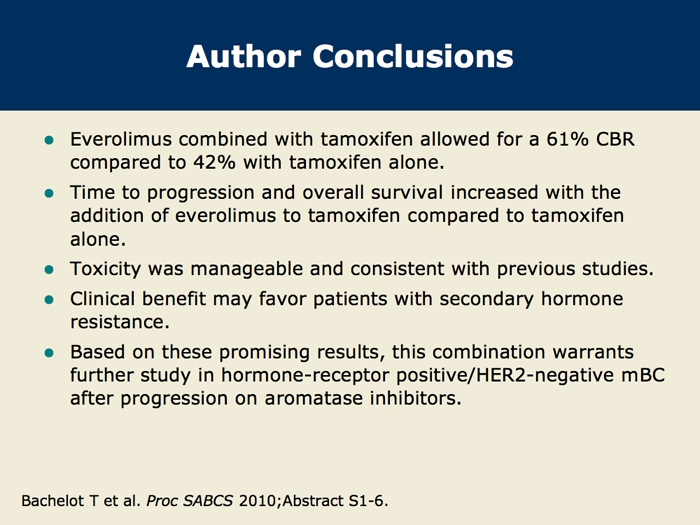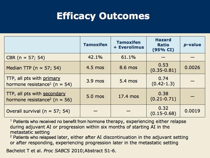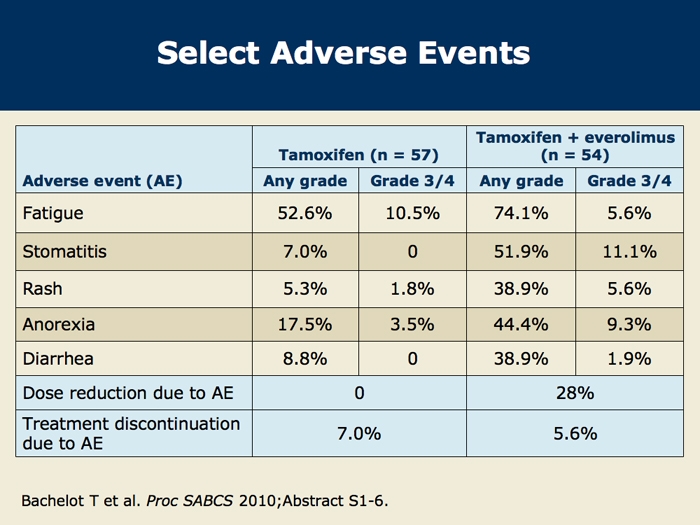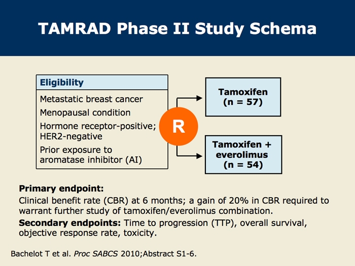 Bachelot T et al. TAMRAD: A GINECO randomized phase II trial of everolimus in combination with tamoxifen versus tamoxifen alone in patients with hormone-receptor positive, HER2 negative metastatic breast cancer with prior exposure to aromatase inhibitors. San Antonio Breast Cancer Symposium 2010; Abstract S6-1.
