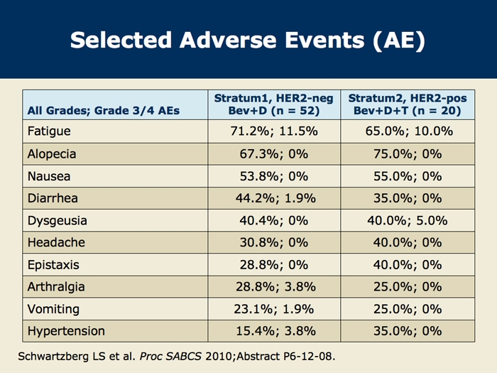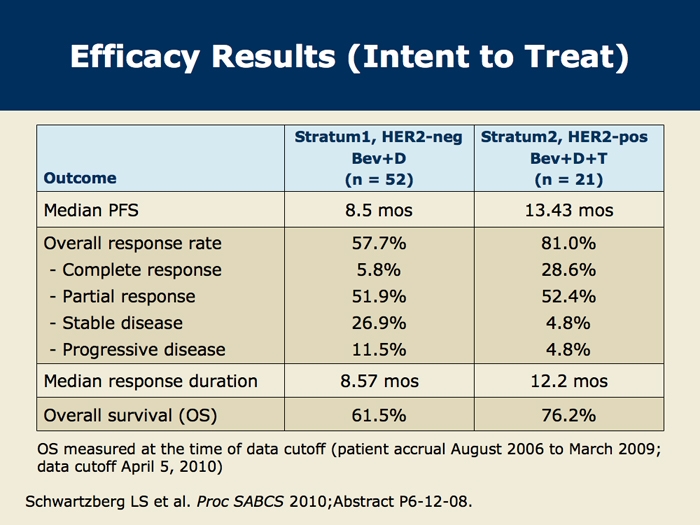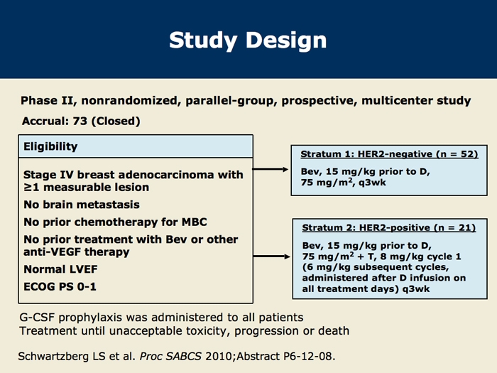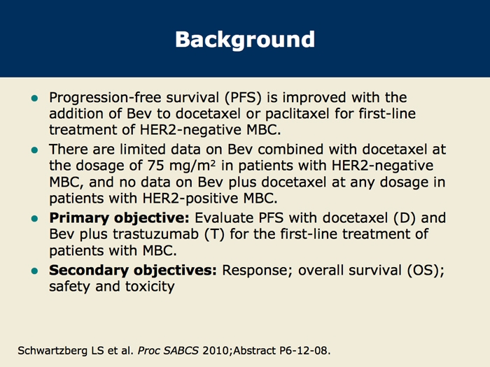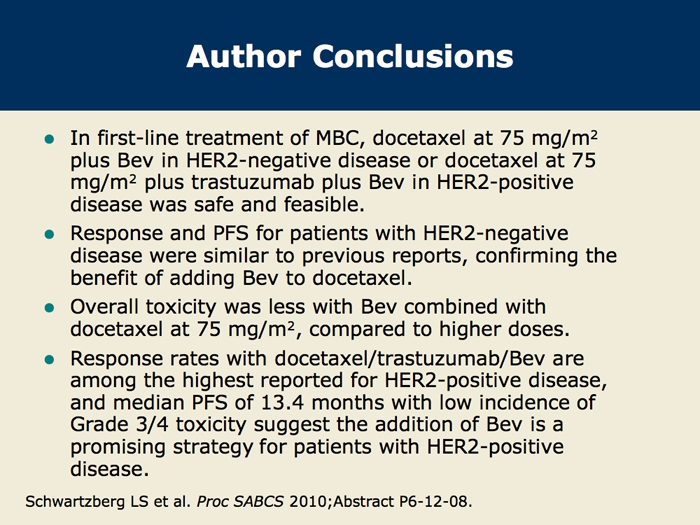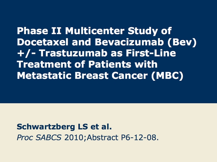 Schwartzberg LS et al. Phase II multicenter study of docetaxel and bevacizumab +/- trastuzumab as first-line treatment of patients with metastatic breast cancer. San Antonio Breast Cancer Symposium 2010;Abstract P6-12-08.