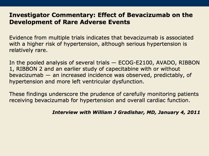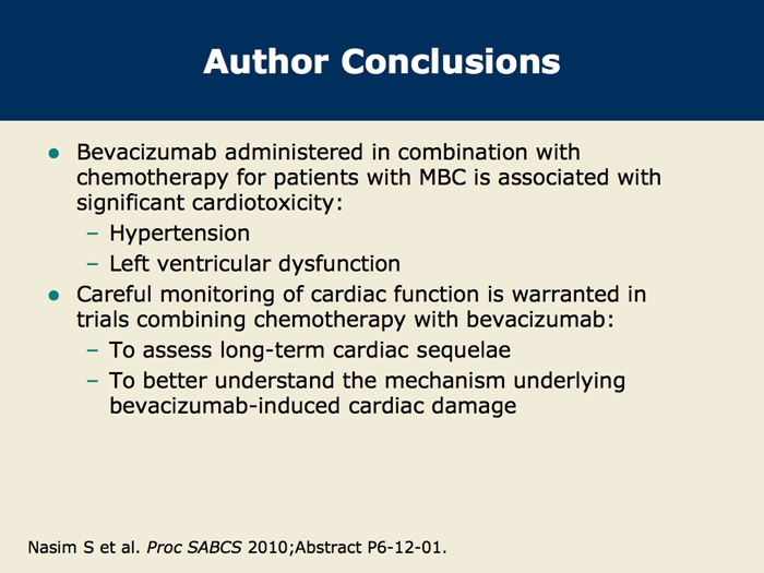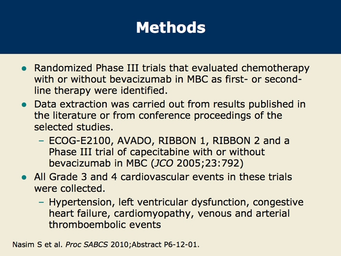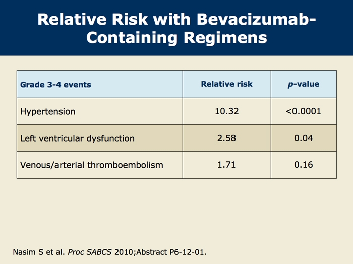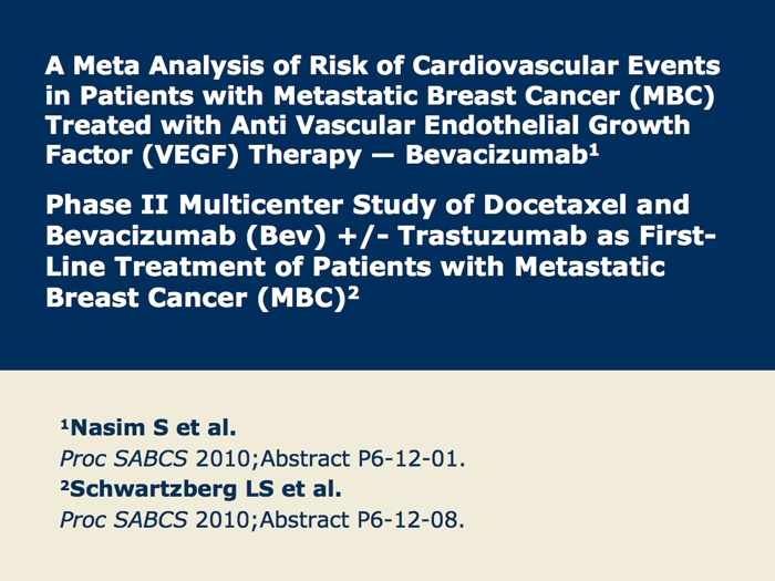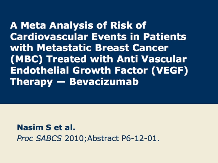 Nasim S et al. A meta-analysis of risk of cardiovascular events in patients with metastatic breast cancer (MBC) treated with anti vascular endothelial growth factor (VEGF) therapy — Bevacizumab. San Antonio Breast Cancer Symposium 2010;Abstract P6-12-01.