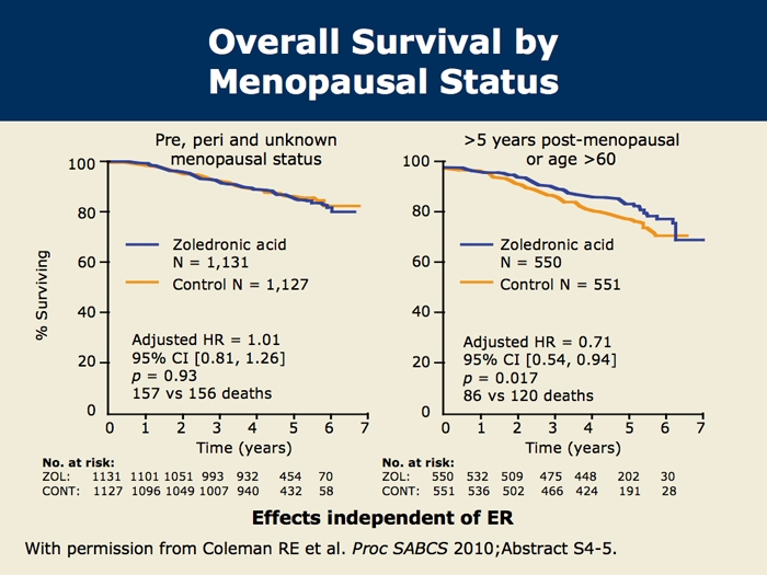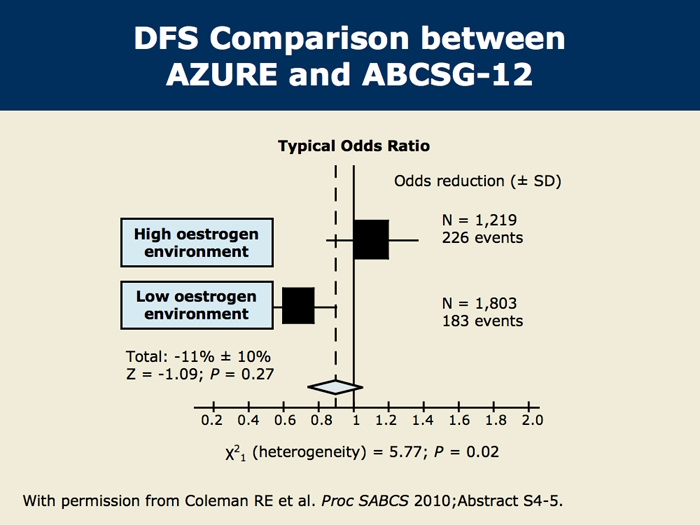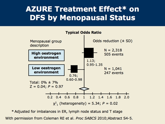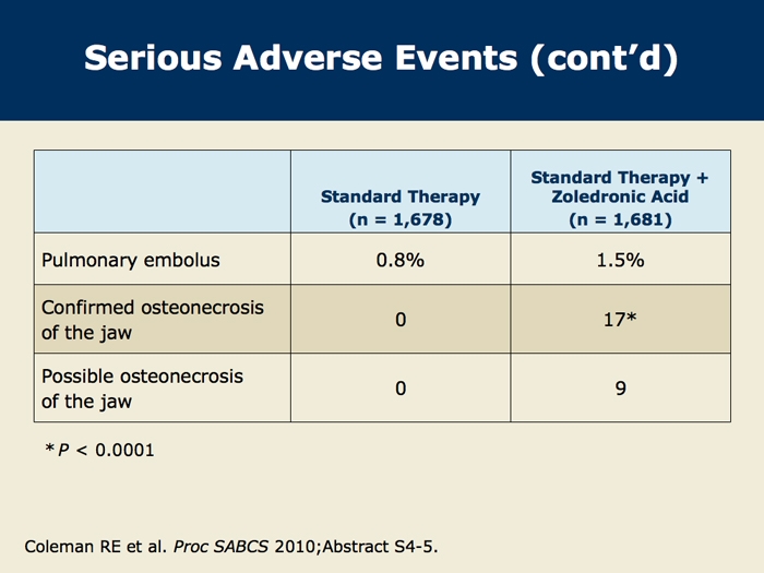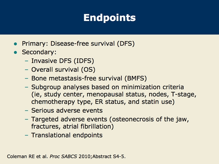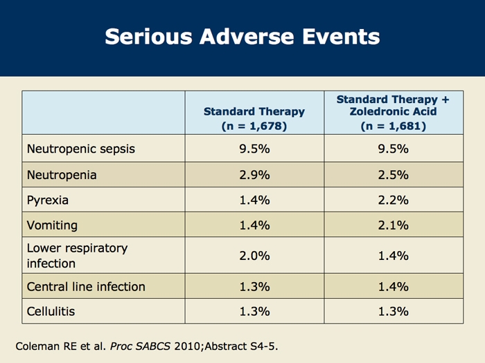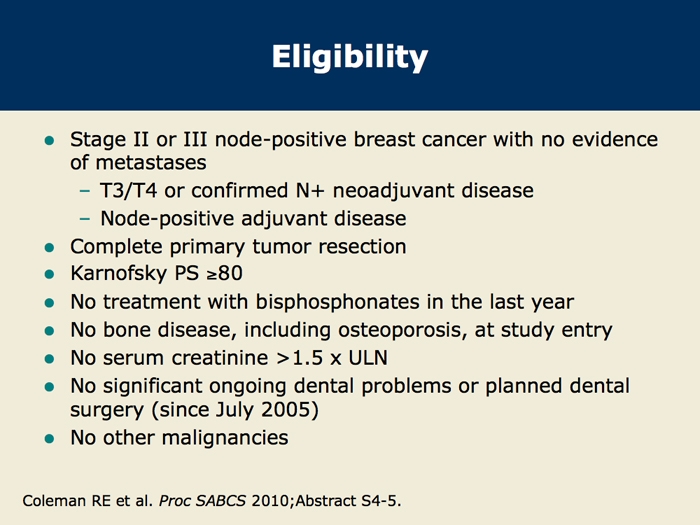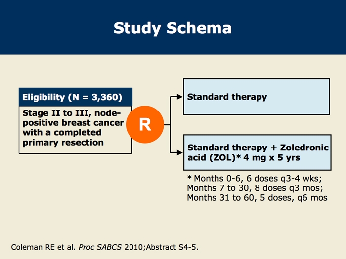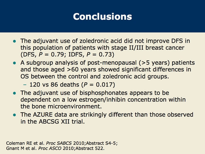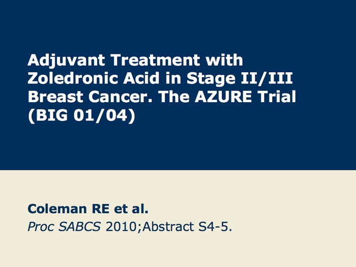 Coleman RE et al. Adjuvant treatment with zoledronic acid in stage II/III breast cancer. The AZURE trial (BIG 01/04). San Antonio Breast Cancer Symposium 2010;Abstract S4-5.