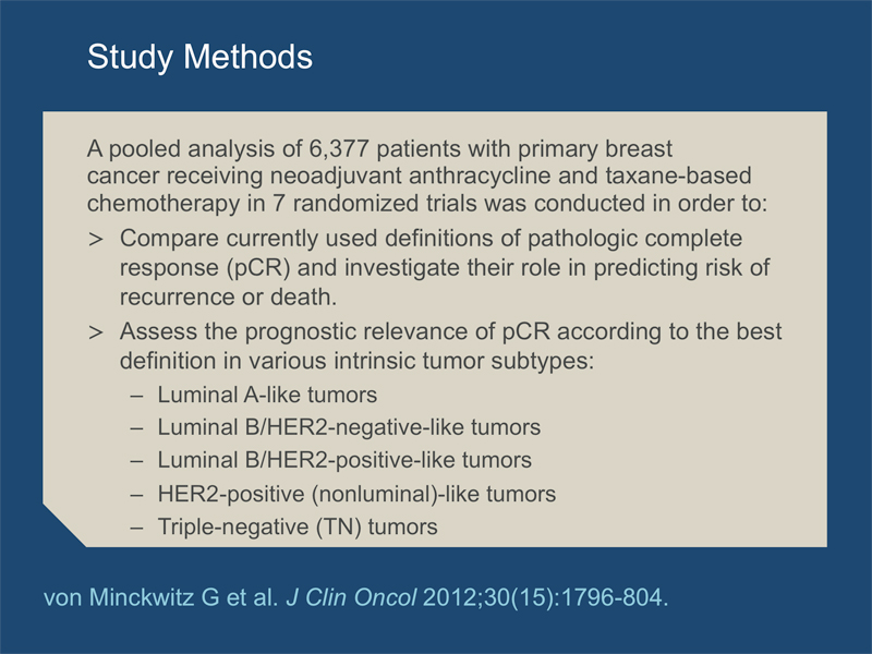 iJournal Club - Breast Cancer: 2012Definition and impact of pathologic complete response (pCR) on prognosis after neoadjuvant chemotherapy (CT) in various intrinsic breast cancer (BC) subtypes (Abstract)