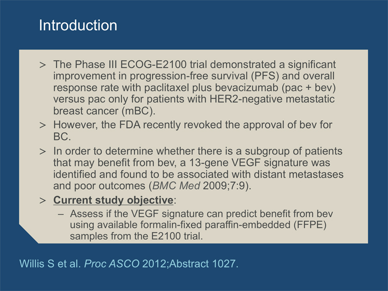 iJournal Club - Breast Cancer: 2012Association of a compact 13-gene VEGF signature with overall survival in the ECOG-E2100 trial of paclitaxel with or without bevacizumab (Bev) as first-line therapy (Abstract)