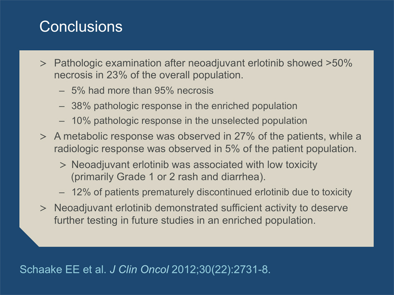 Across all of oncology there is considerable interest in evaluating neoadjuvant treatment with novel agents for patients with targetable mutations, and this study establishes that neoadjuvant erlotinib is safe and does not prevent NSCLC patients in an unselected population from going on to surgery. Of particular interest, 3 of the 7 patients in this pilot initiative with EGFR mutations experienced partial responses to erlotinib prior to resection. A similar neoadjuvant strategy is soon to be studied in the cooperative groups for patients with locally advanced disease about to receive combined chemoradiation therapy. |