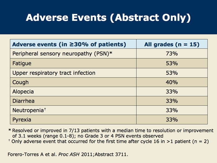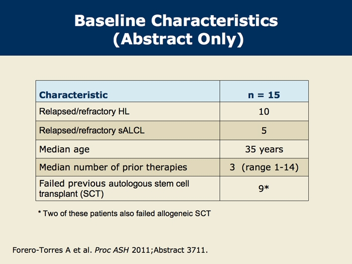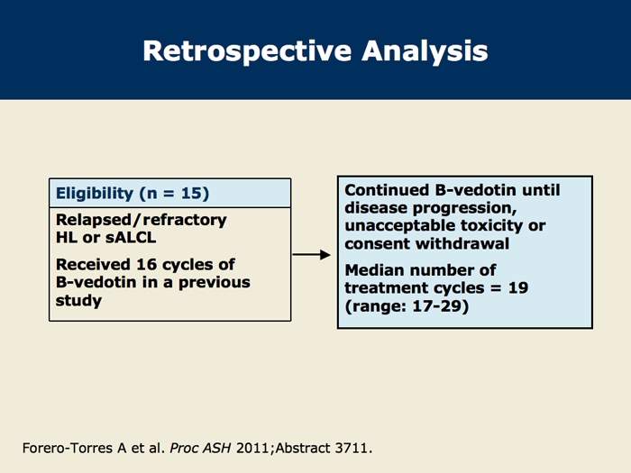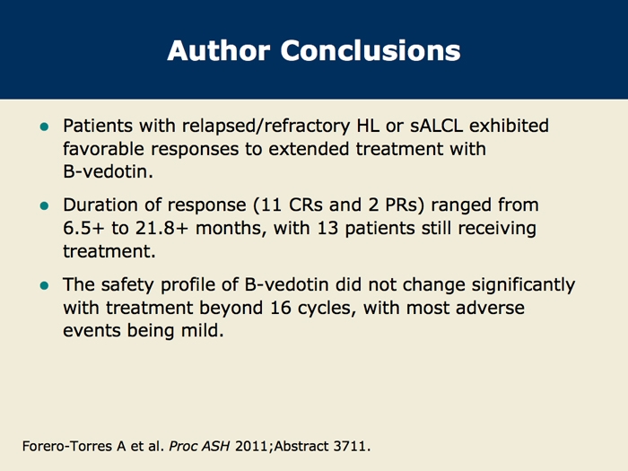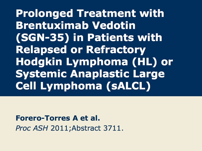 Forero-Torres A et al. Prolonged treatment with brentuximab vedotin (SGN-35) in patients with relapsed or refractory Hodgkin lymphoma (HL) or systemic anaplastic large cell lymphoma (sALCL). Proc ASH 2011;Abstract 3711.