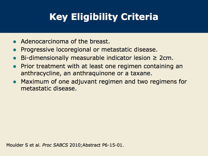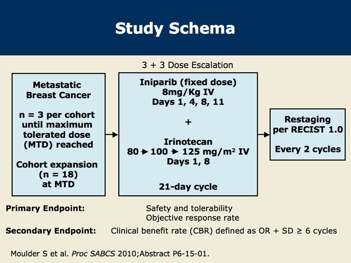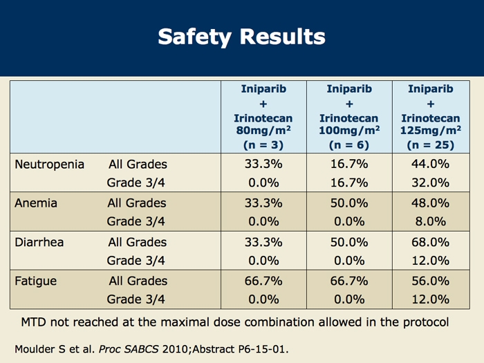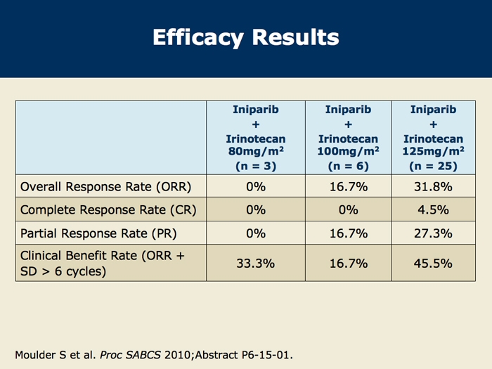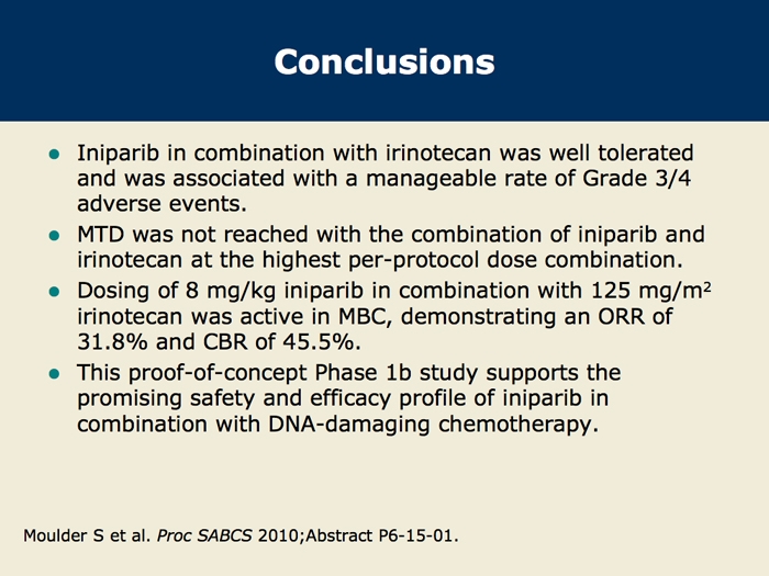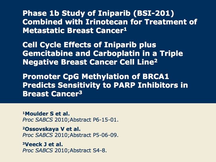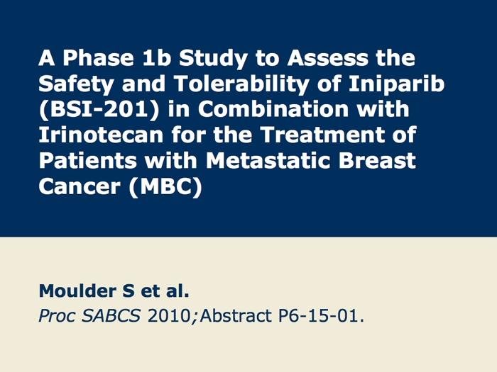 Moulder S et al. A phase 1b study to assess the safety and tolerability of iniparib (BSI-201) in combination with irinotecan for the treatment of patients with metastatic breast cancer (MBC). San Antonio Breast Cancer Symposium 2010;Abstract P6-15-01.