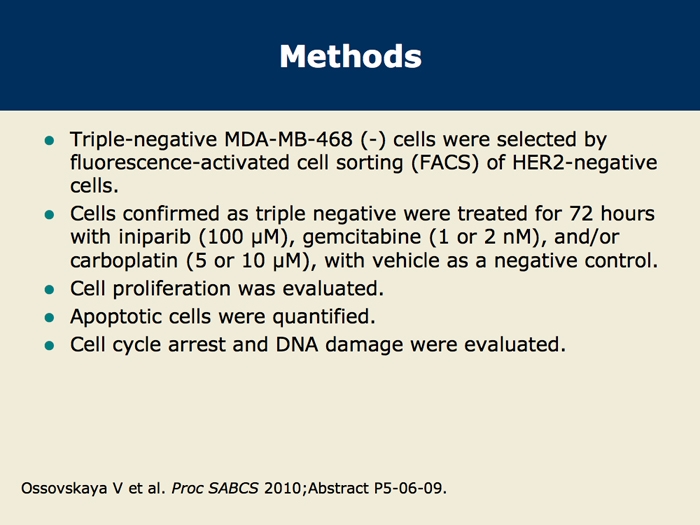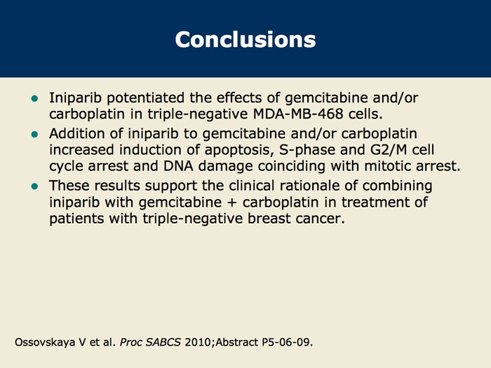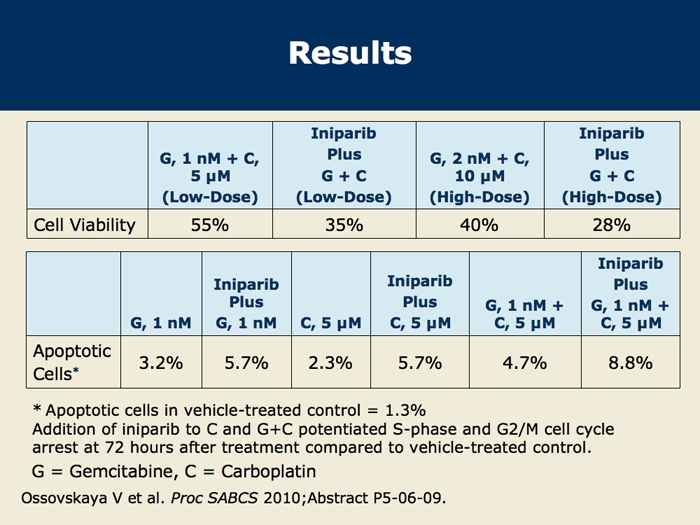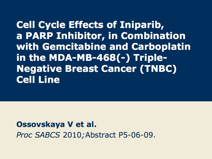 Ossovskaya V et al. Cell cycle effects of iniparib, a PARP inhibitor, in combination with gemcitabine and carboplatin in the MDA-MB-468(-) triple-negative breast cancer (TNBC) cell line. San Antonio Breast Cancer Symposium 2010;Abstract P5-06-09.