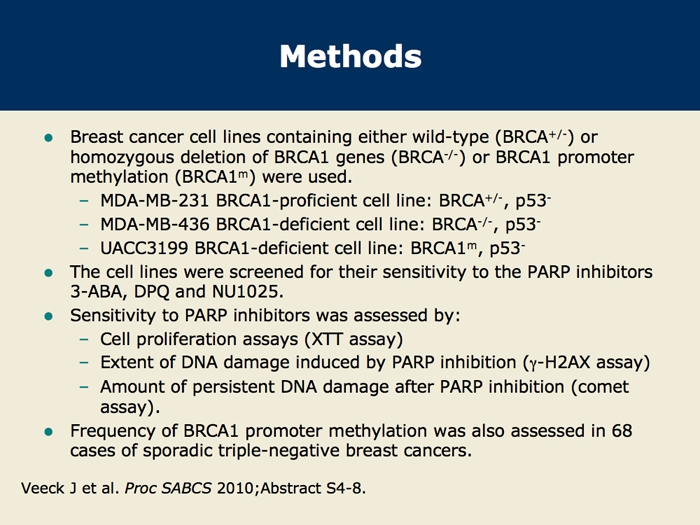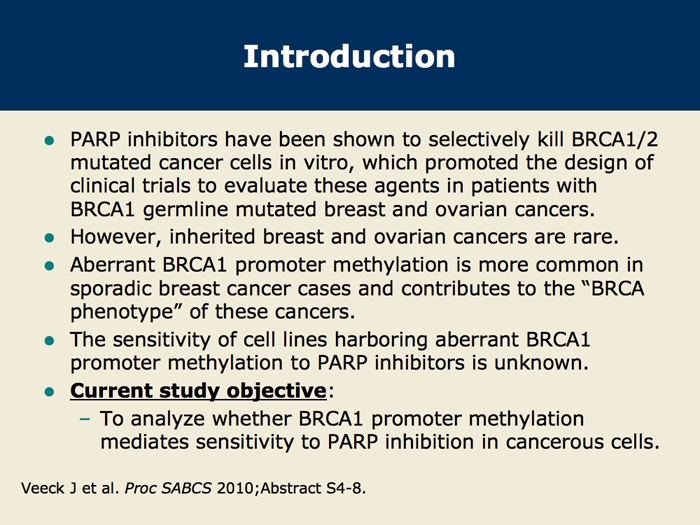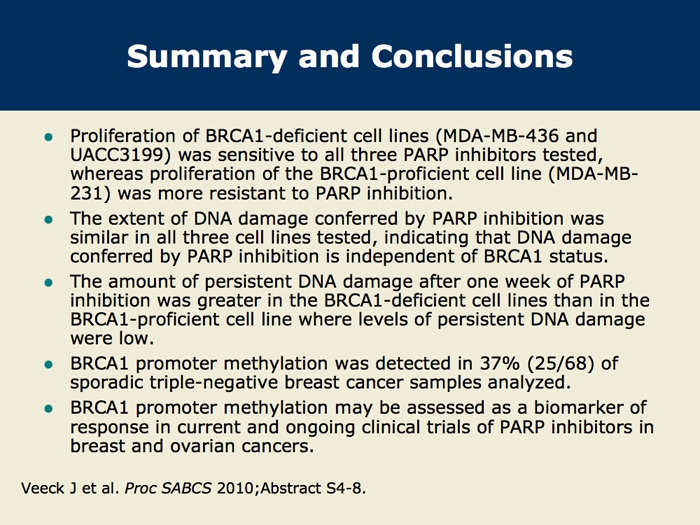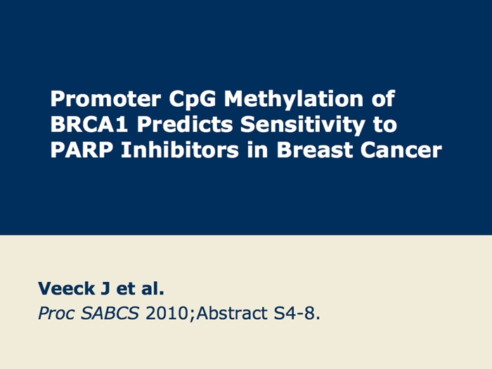Veeck J et al. Promoter CpG methylation of BRCA1 predicts sensitivity to PARP inhibitors in breast cancer. San Antonio Breast Cancer Symposium 2010;Abstract S4-8.
